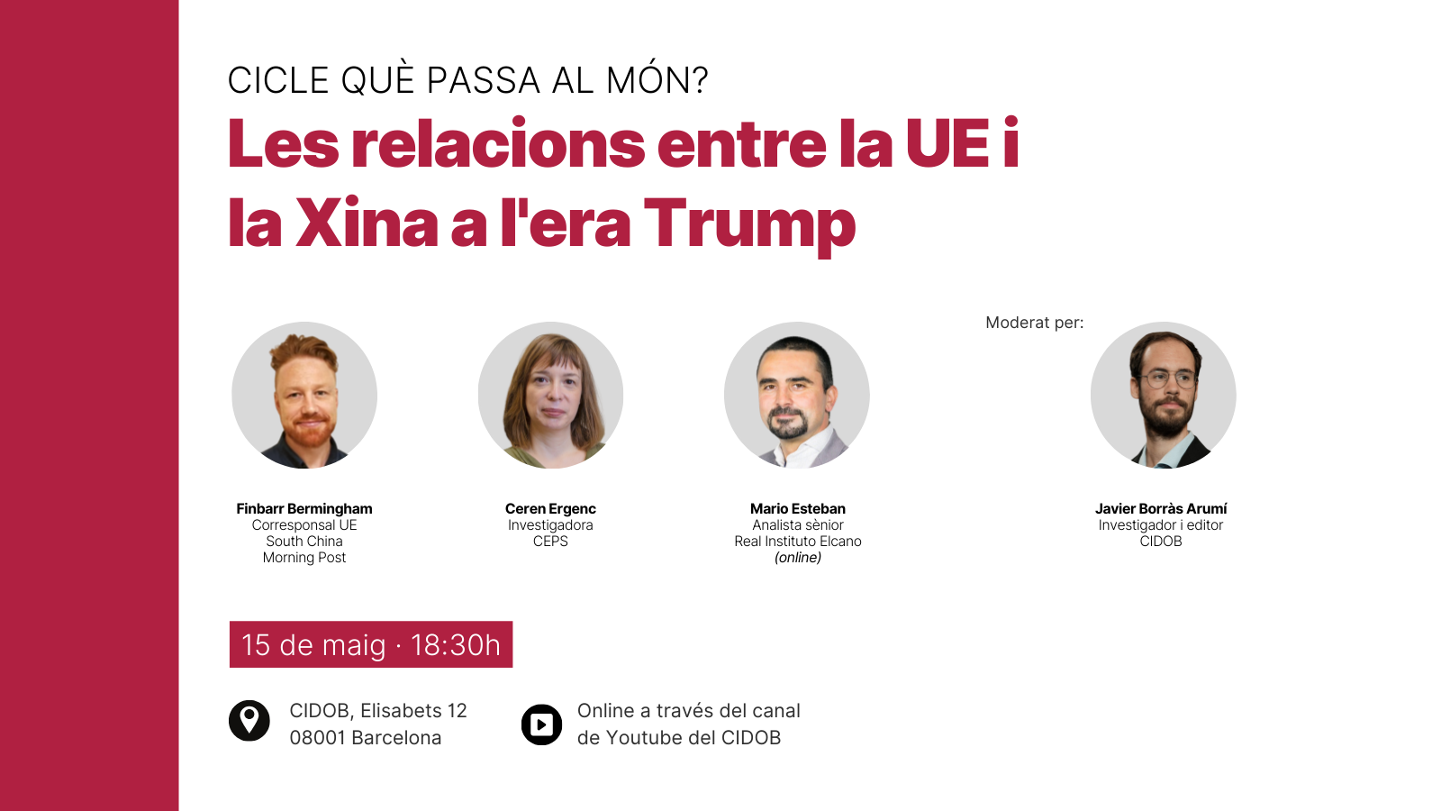 La sessió es desenvoluparà en anglès, amb servei de traducció simultània al català i castellà, i es podrà seguir en directe al canal de YouTube del CIDOB. L’assistència és gratuïta amb inscripció prèvia, tant presencial com en línia.