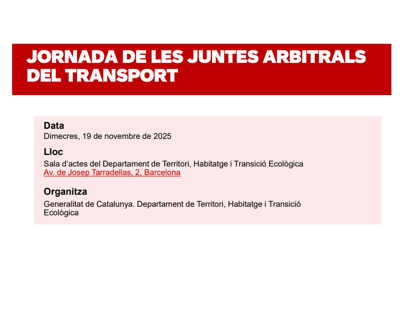El dia 19 de novembre de 2025, de 9 a 14 h, se celebra la Jornada de les juntes arbitrals del transport, organitzada pel Departament de Territori, Habitatge i Transició Ecològica de la Generalitat de Catalunya.