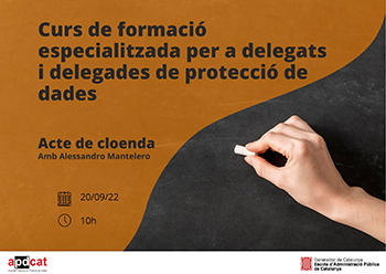 L’Autoritat Catalana de Protecció de Dades (APDCAT) i l’Escola d’Administració Pública de Catalunya (EAPC) organitzen el dimarts 20 de setembre de 2022, a les 10.00 h, l’acte de cloenda del Curs de formació especialitzada per a delegats i delegades de protecció de dades (DPD) de les administracions públiques i el seu sector públic, que impulsen conjuntament ambdues entitats.