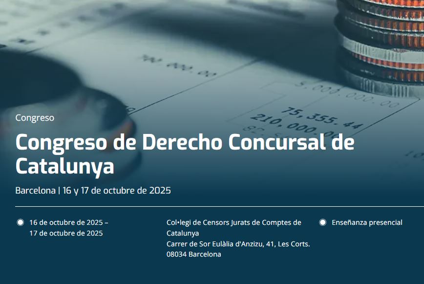 Els dies 16 i 17 d'octubre de 2025, tindrà lloc el Congrés de Dret Concursal de Catalunya organitzat per Aranzadi i la col·laboració de l’Il·lustre Col·legi de l’Advocacia de Barcelona i el Col·legi de Censors Jurats de Comptes de Catalunya.
