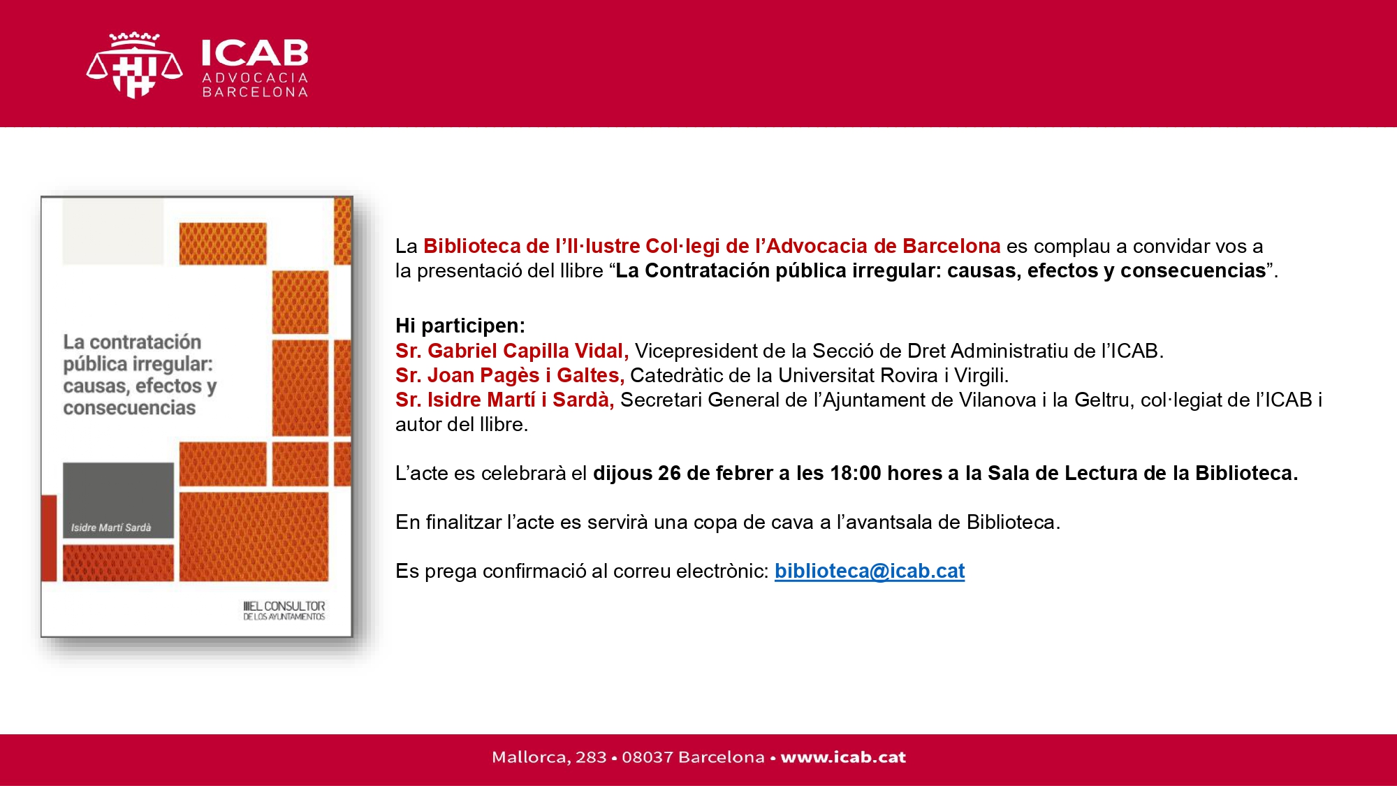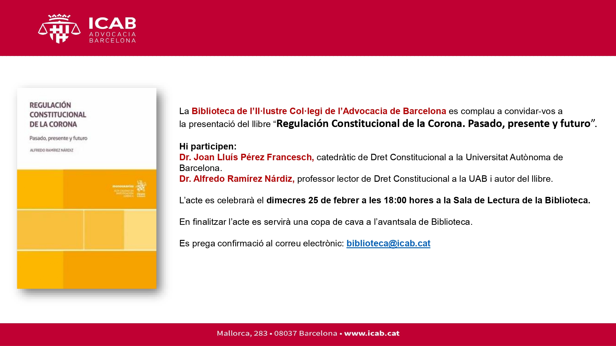 Es prega confirmació al correu electrònic: biblioteca@icab.cat
