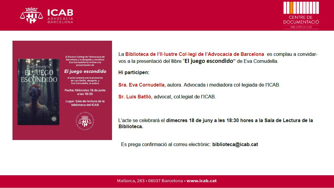 La Biblioteca de l’Il·lustre Col·legi de l’Advocacia de Barcelona (ICAB) celebra el dimecres 18 de juny de 2025, a les 18.30 hores, a la Sala de Lectura, la presentació del llibre “El juego escondido”, d'Eva Cornudella.