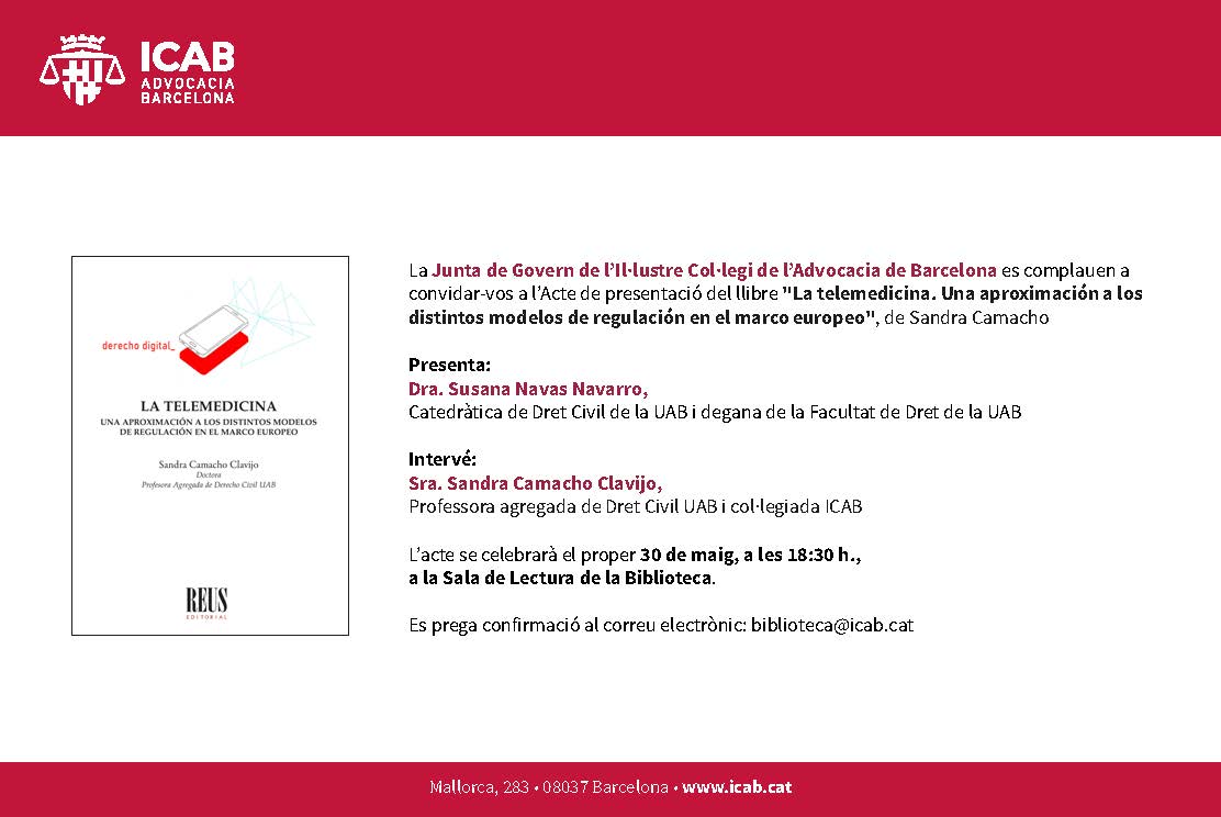L’Il·lustre Col·legi de l’Advocacia de Barcelona acollirà l’acte de presentació del llibre "La telemedicina. Una aproximación a los distintos modelos de regulación en el marco europeo", de Sandra Camacho.