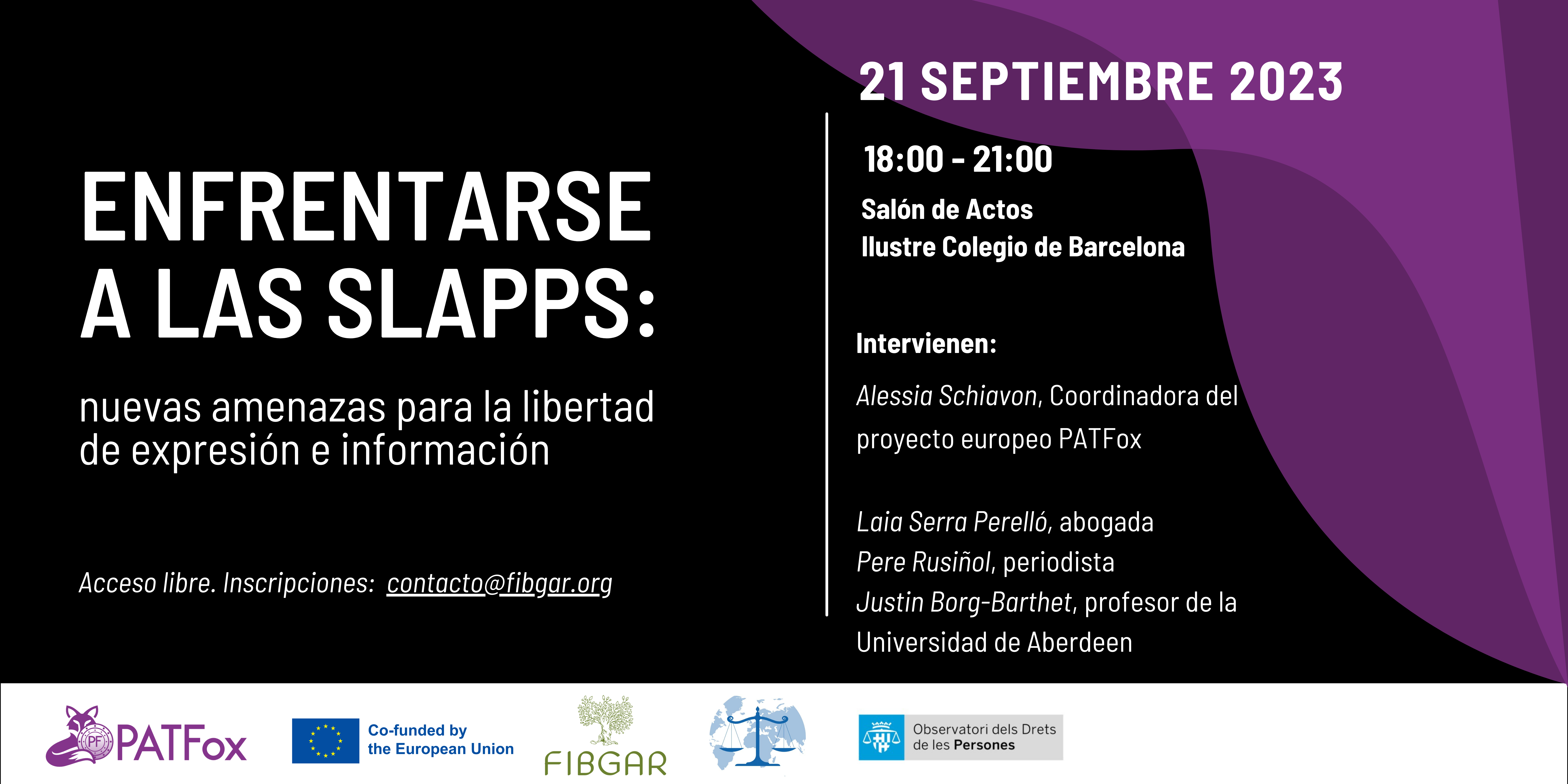 En el marc del projecte europeu PATFox (Pioneering AntiSLAPP Training for Freedom of Expression), la Fundació Internacional Baltasar Garzón (FIBGAR), la Comissió de Justícia Penal Internacional i Drets Humans i l'Observatori dels Drets de les Persones de l'Il·lustre Col·legi de Barcelona (ICAB) organitzen la jornada de formació "Enfrontar-se a les SLAPPs: noves amenaces per a la llibertat dʻexpressió i informació".