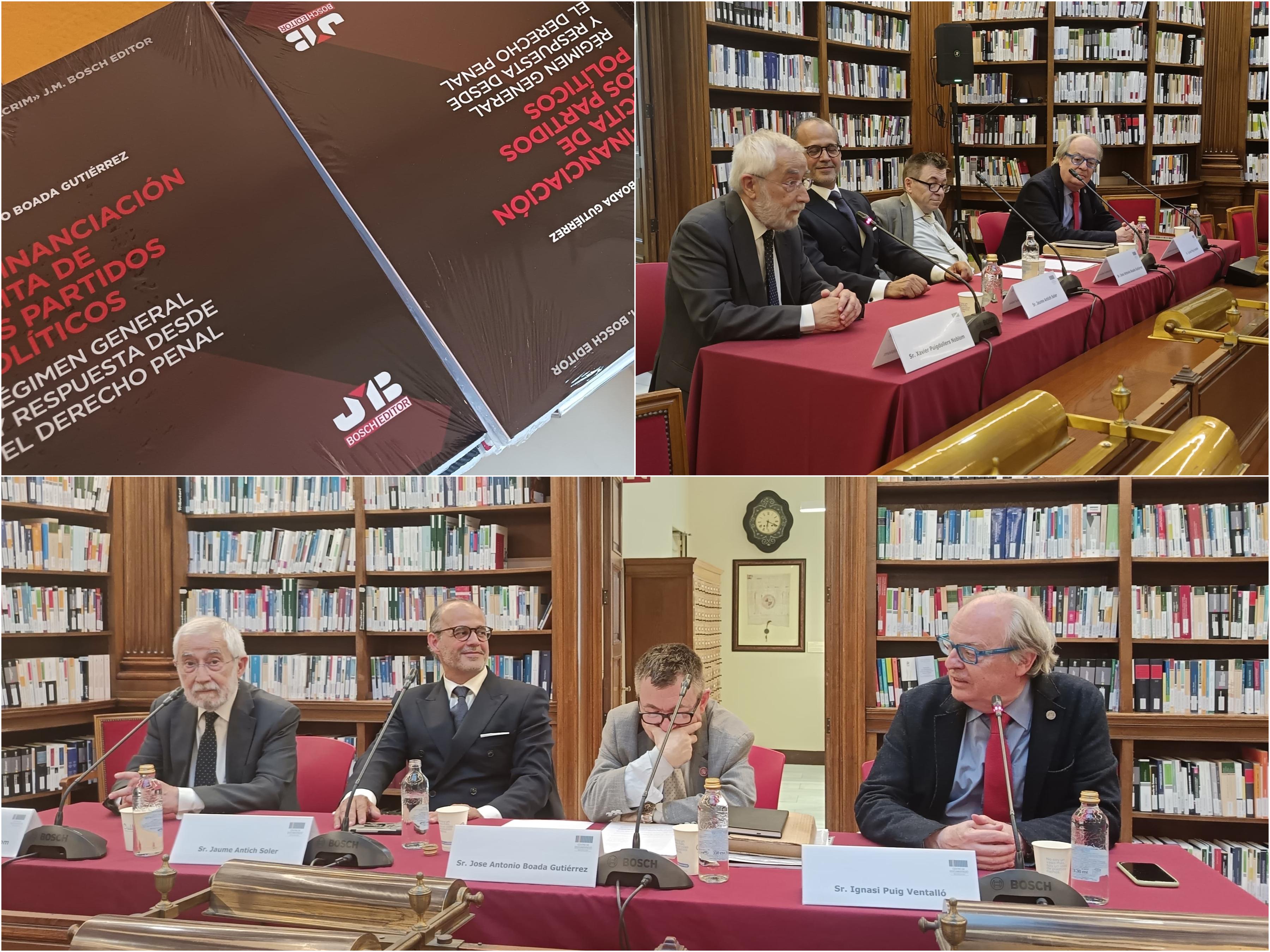 L’acte es va celebrar a la Sala de Lectura de la Biblioteca i va comptar amb la participació destacada de diverses figures del món jurídic i acadèmic. L’autor de l’obra, José Antonio Boada Gutiérrez —col·legiat de l’ICAB, analista financer i doctorant en Dret Penal Econòmic—, va exposar els principals eixos del llibre, que analitza de manera rigorosa el règim jurídic general del finançament dels partits polítics i la resposta que ofereix el dret penal davant les seves irregularitats.