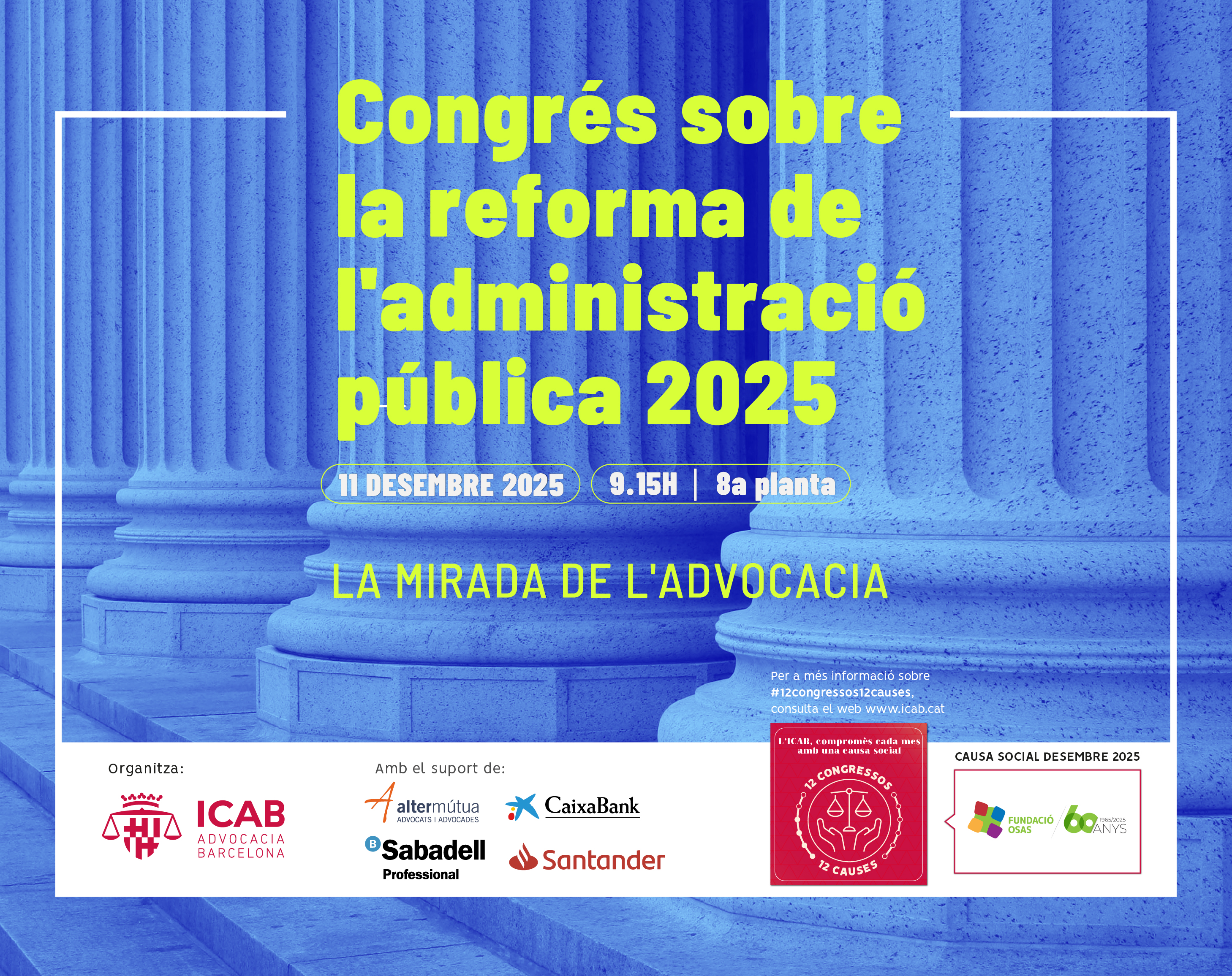 El ‘Congrés sobre la reforma de l’Administració Pública 2025. La mirada de l’advocacia’ s’emmarca en el projecte institucional “12 Congressos, 12 Causes”, una iniciativa que amb el lema “L’ICAB, compromès cada mes amb una causa social”, té com a objectiu posar en valor la funció social de l’advocacia tot vinculant els principals congressos jurídics que organitza aquesta Corporació amb 12 entitats que treballen desinteressadament per transformar la societat, defensar els drets i millorar la vida de les persones.