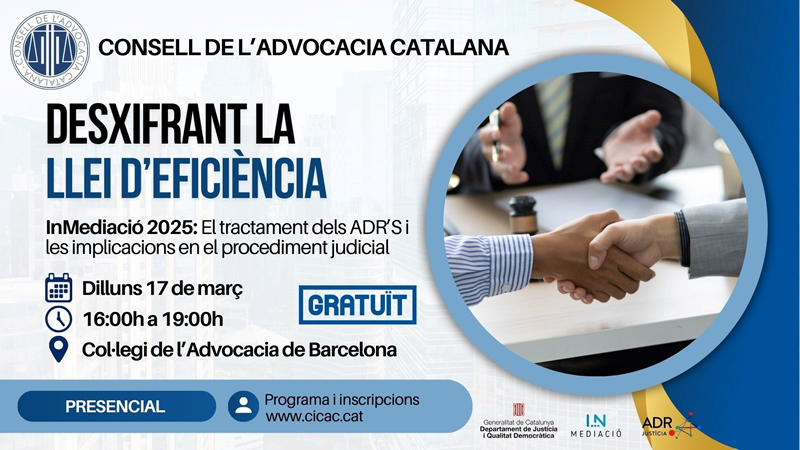 17/03/2025, a les 16h, com a part del Programa InMediació 2025. Organitzat pel Consell de l’Advocacia Catalana amb el suport del Departament de Justícia i Qualitat Democràtica de la Generalitat de Catalunya.