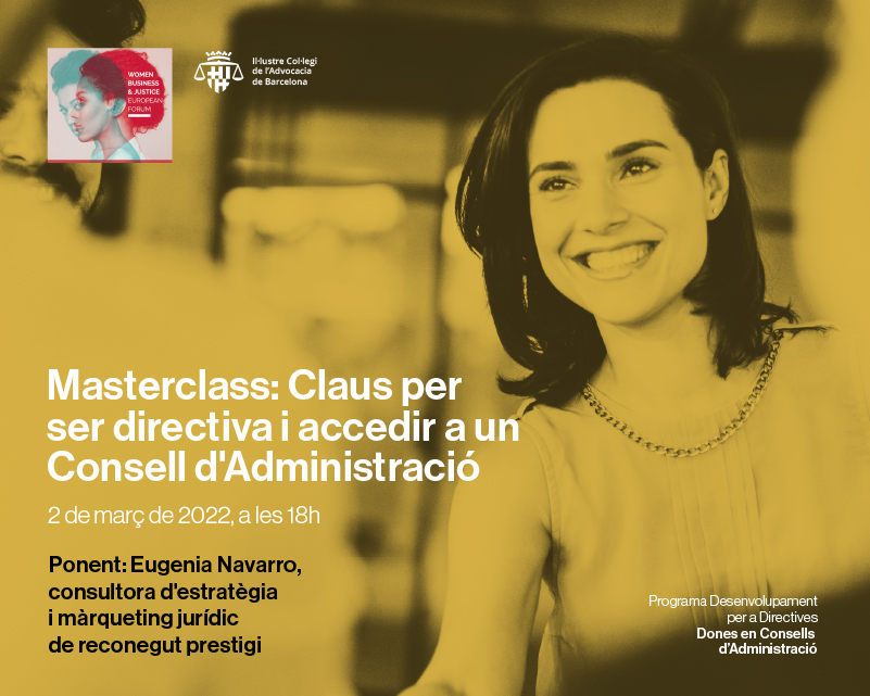 Com a tastet previ, i per aprofundir en aquest curs, el dia 2 de març de 2022, a les 18h, tindrà lloc la Masterclass ON-LINE amb el títol Claus per ser directiva i accedir a un Consell d'Administració, on hi participarà com a ponent Eugenia Navarro, consultora d'estratègia i màrqueting jurídic de reconegut prestigi.