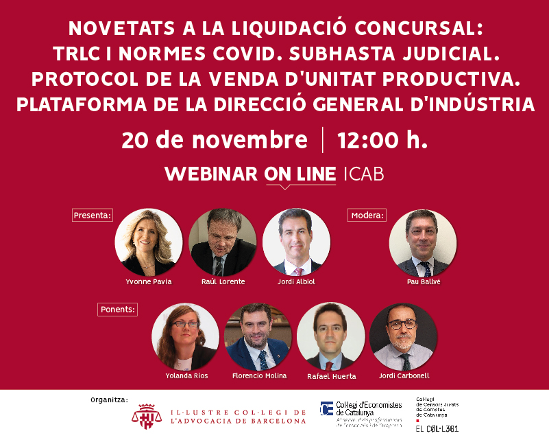 Webinar: Novetats a la Liquidació concursal: TRLC i Normes Covid. Subhasta Judicial. Protocol de la venda d'unitat productiva. Plataforma de la Direcció General d'Indústria.
