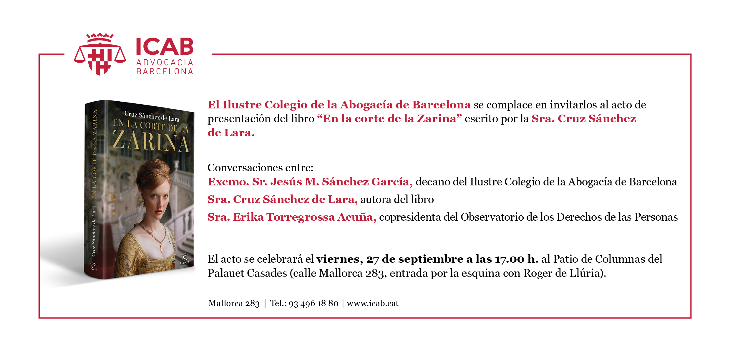 El Ilustre Colegio de la Abogacía de Barcelona se complace en invitarle al acto de presentación del libro "En la corte de la Zarina" escrito por la Sra. Cruz Sánchez de Lara.