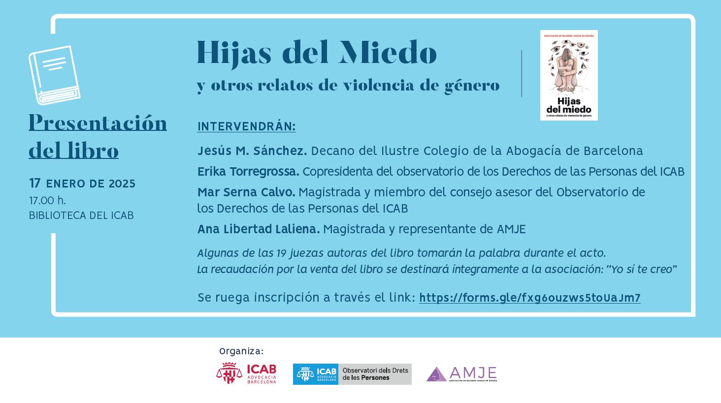 El Observatorio de los Derechos de las Personas del Ilustre Colegio de la Abogacía de Barcelona organiza el próximo 17 de enero de 2025, a las 17 h, en el Salón de Actos del ICAB, la presentación del libro "Hijas del Miedo y otros relatos de violencia de género", elaborado por la Asociación Mujeres Juezas de España (AMJE).