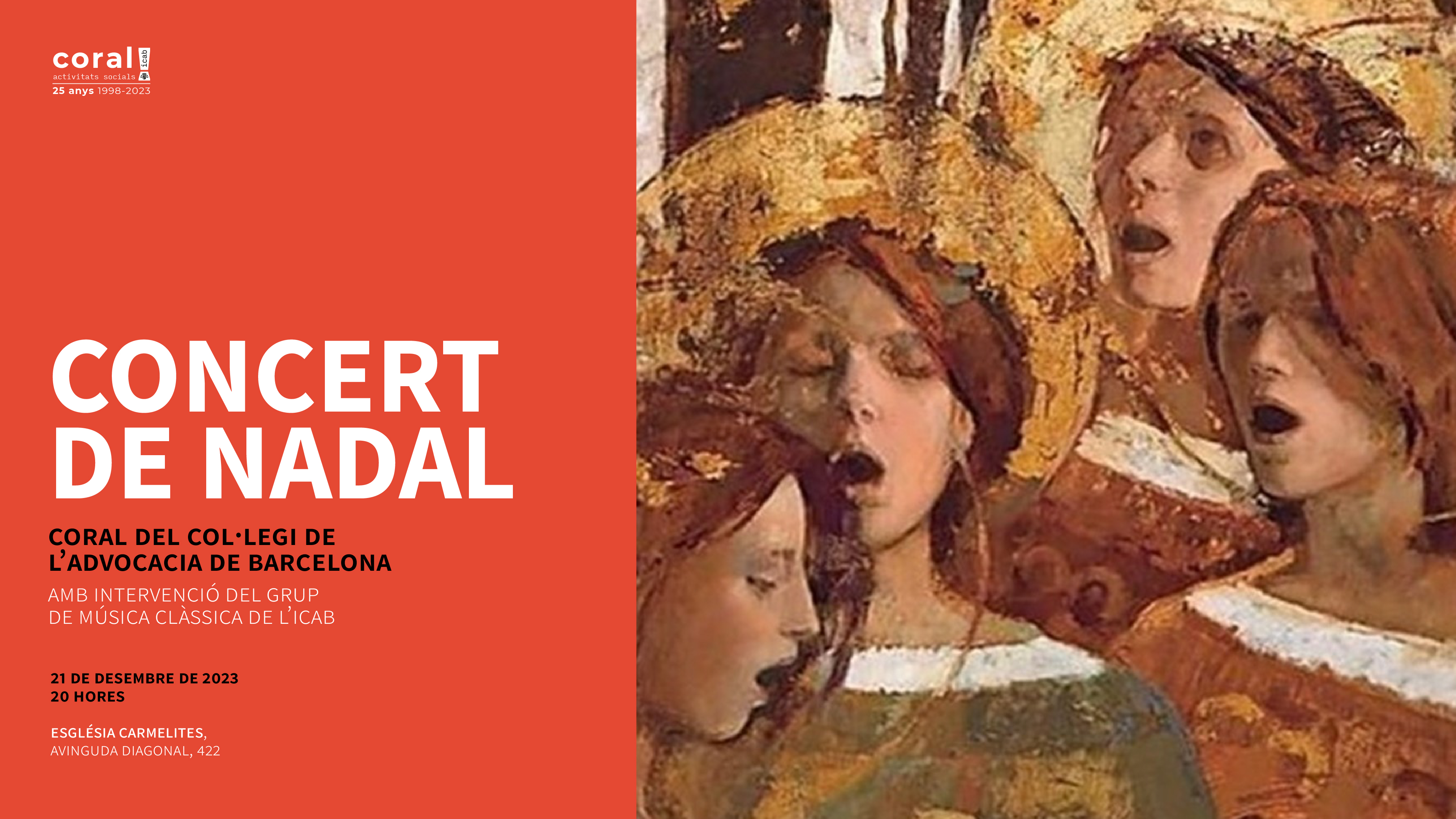 El próximo jueves 21 de diciembre de 2023, a las 20h, en la Iglesia Carmelitas (Avenida Diagonal, 422) de Barcelona, tendrá lugar el tradicional Concierto de Navidad de la Coral del Ilustre Colegio de la Abogacía de Barcelona (ICAB). El recital contará con la intervención del Grupo de Música Clásica del Colegio.