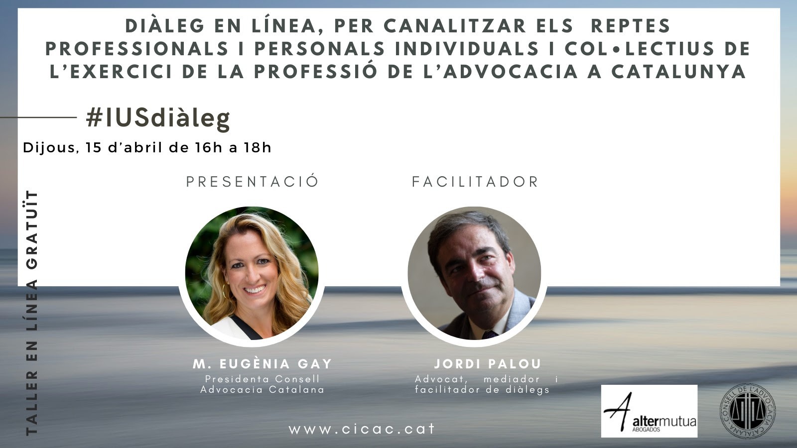 El Consell de l'Advocacia Catalana y Alter Mutua impulsan para el próximo jueves 15 de abril de 2021 un nuevo espacio de reflexión, llamado #IUSdiàleg, destinado a tratar de forma corporativa los retos individuales y colectivos, personales y profesionales de personas abogadas y mediadoras, teniendo en cuenta la difícil situación originada por la pandemia del COVID-19.