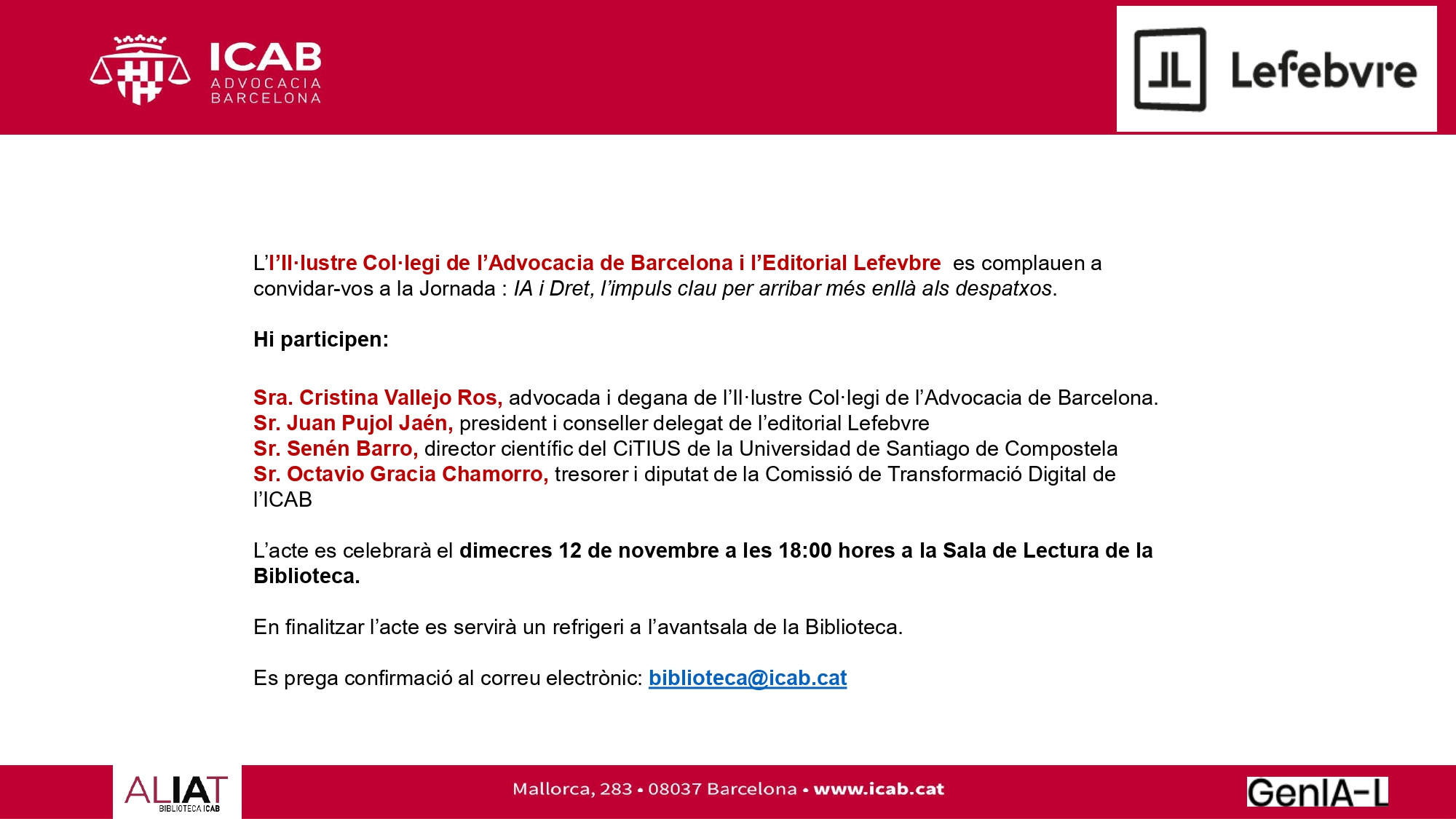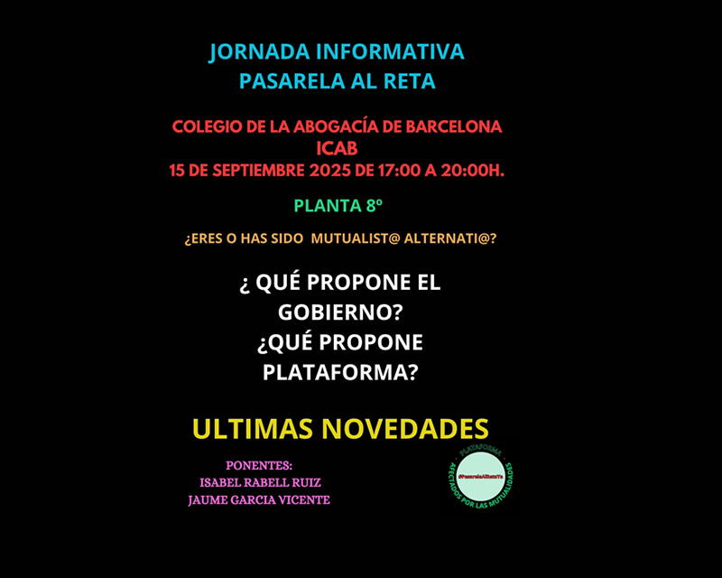 La 8ª planta del ICAB acogerá el 15 de septiembre de 2025, de 17 a 20 h, la Jornada Informativa Pasarela al RETA, organizada por la Plataforma "Afectados por las Mutualidades #PasarelaAlRetaYa".