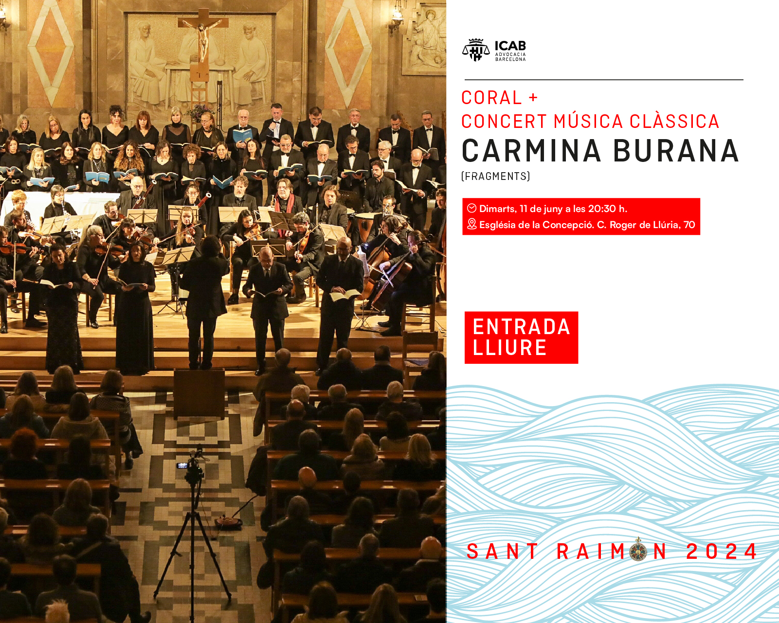 El tradicional Concierto de la Coral del ICAB con ocasión de Sant Raimon de Penyafort tendrá lugar el martes 11 de junio de 2024 a las 20.30h en la Iglesia de la Concepción de Barcelona (c/ Roger de Llúria, 70).