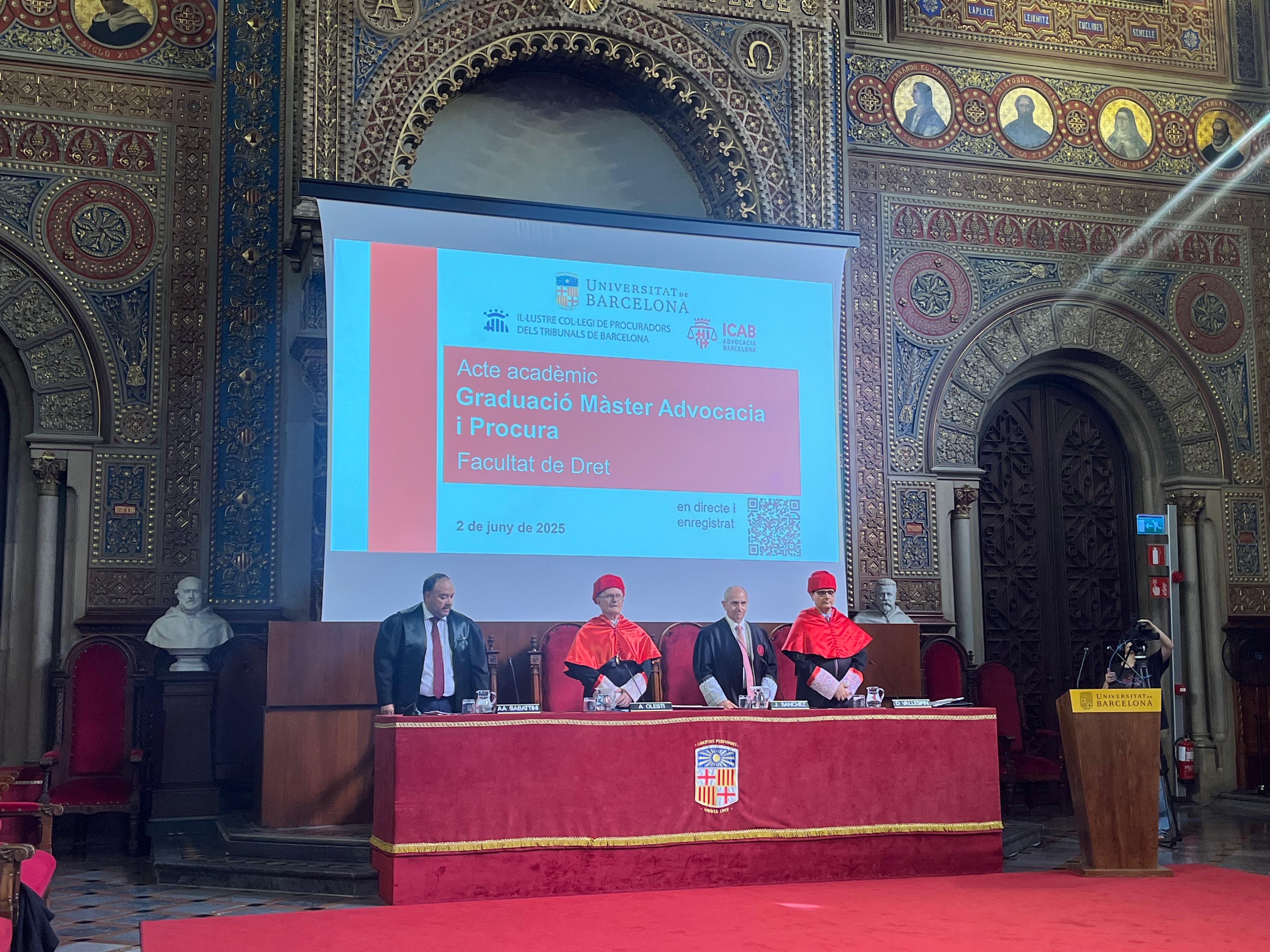 El acto, presidido por Andreu Olesti, decano de la Facultad de Derecho de la Universidad de Barcelona, contó también con la participación de David Vallespín, coordinador del Máster y padrino de la promoción, y de Anthony Angelo Sabattini, vocal de la Junta de Gobierno del Ilustre Colegio de Procuradores de los Tribunales de Barcelona.