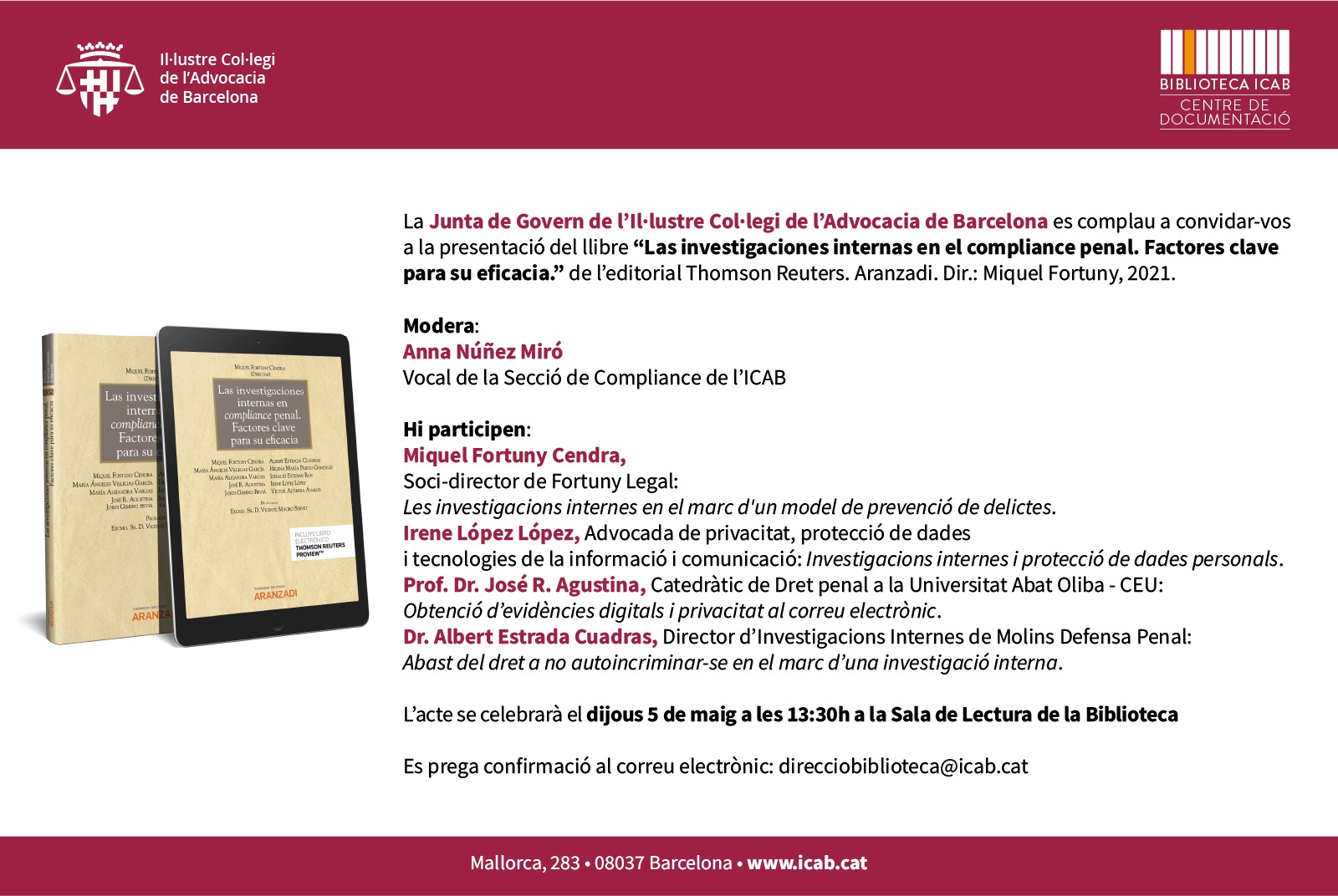 La Sala de Lectura de la Biblioteca del Ilustre Colegio de la Abogacía de Barcelona ha sido el escenario, el jueves 5 de mayo de 2022, del acto de presentación del libro "Las investigaciones internas en el compliance penal. ... -