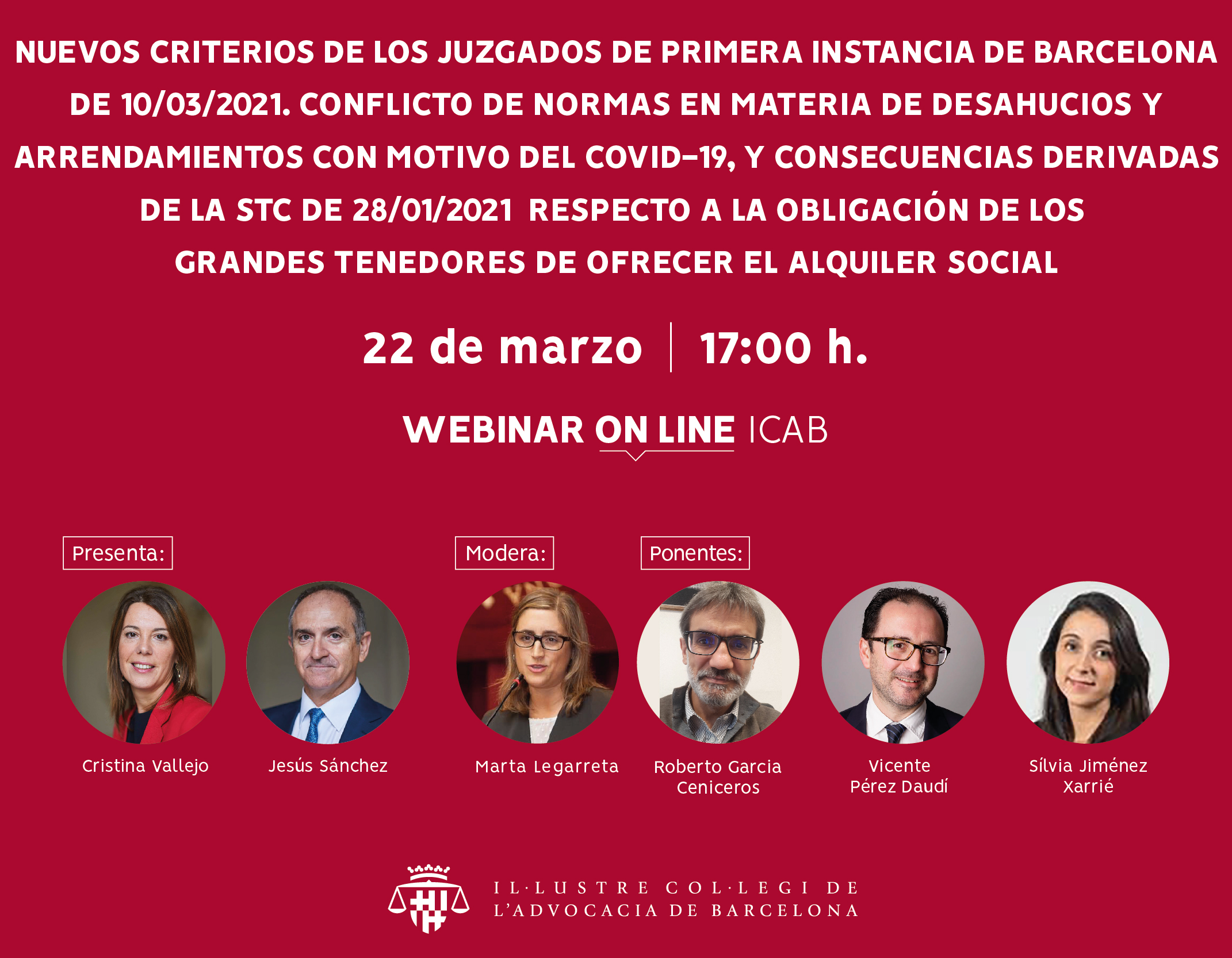 Webinar: Nuevos criterios de los Juzgados de Primera Instancia de Barcelona de 10/03/2021. Conflicto de normas en materia de desahucios y arrendamientos con motivo del COVID-19, y consecuencias derivadas de la STC de 28/01/2021 respecto a la obligación de los grandes tenedores de ofrecer el alquiler social