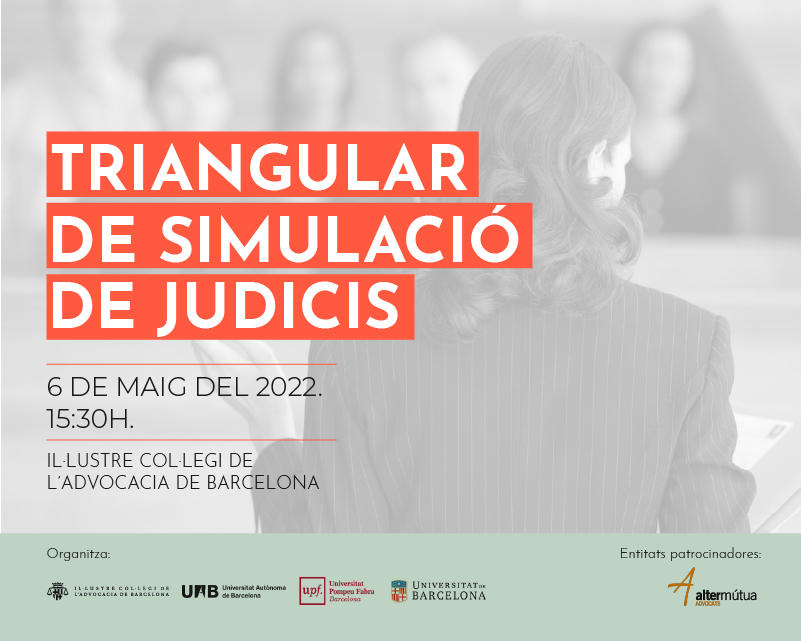 El Col·legi de l’Advocacia de Barcelona celebrarà el 6 de maig de 2022, a les 15.30h, la 4a edició del Triangular d’Universitats amb la col·laboració de la UPF Barcelona School of Manegement (UPF – BSM), la Universitat de Barcelona (UB) i la Universitat Autònoma de Barcelona (UAB) amb l’objectiu de posar en pràctica els coneixements adquirits durant el Màster d’Accés a l’Advocacia, però també per enfrontar-se a un judici real.