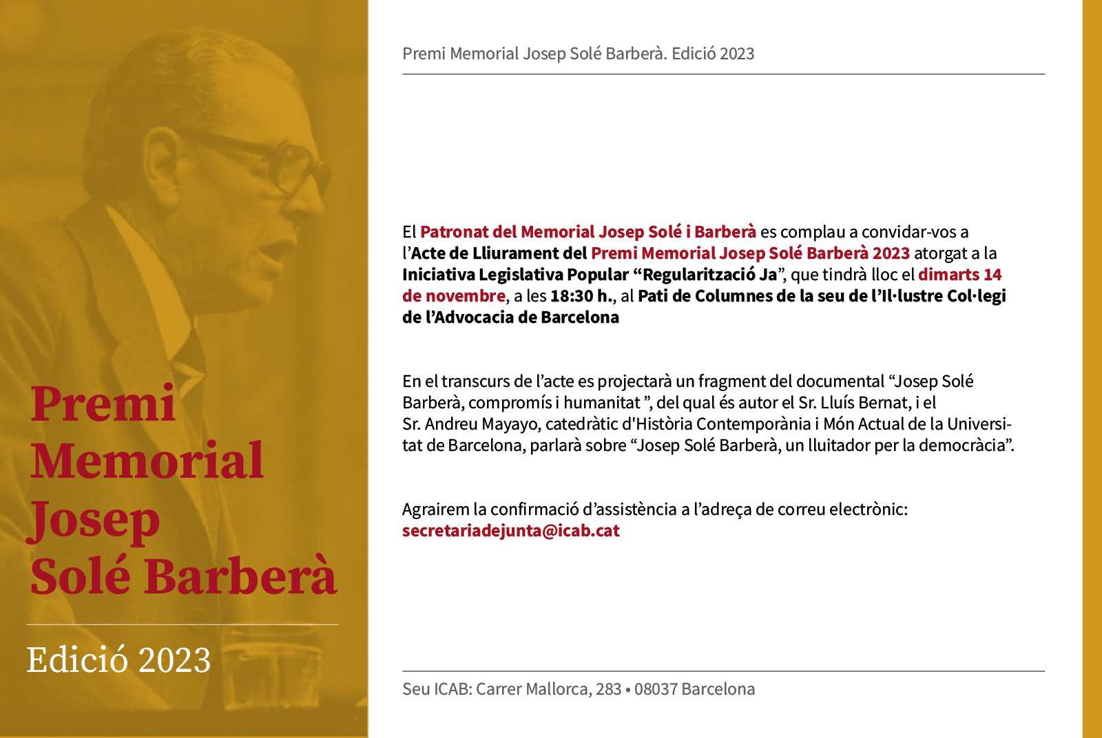 El Patronat del Memorial Josep Solé i Barberà convoca l’Acte de Lliurament del Premi Memorial Josep Solé Barberà 2023 atorgat a la Iniciativa Legislativa Popular “Regularització Ja”, que tindrà lloc el dimarts 14 de novembre, a les 18:30h, al Pati de Columnes de la seu de l’Il·lustre Col·legi de l’Advocacia de Barcelona (ICAB).