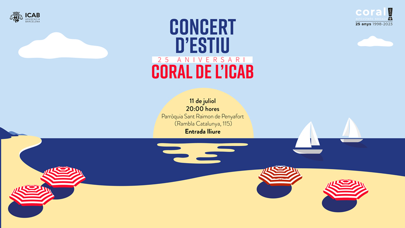 L'11 de juliol de 2023, a les vuit del vespre, tindrà lloc el tradicional Concert d'Estiu de la Coral de l'ICAB. Serà a la Parròquia de Sant Raimon de Penyafort (Rambla de Catalunya, 115) de Barcelona. Entrada lliure fins a completar l'aforament. Commemoració del 25è Aniversari.