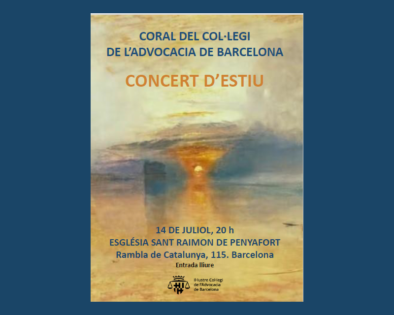 La Coral del Col·legi de l'Advocacia de Barcelona oferirà el dijous 14 de juliol de 2022, a les 20h, el seu tradicional concert d'estiu a l'Església Sant Raimon de Penyafort (Rambla de Catalunya, 115). Entrada lliure.