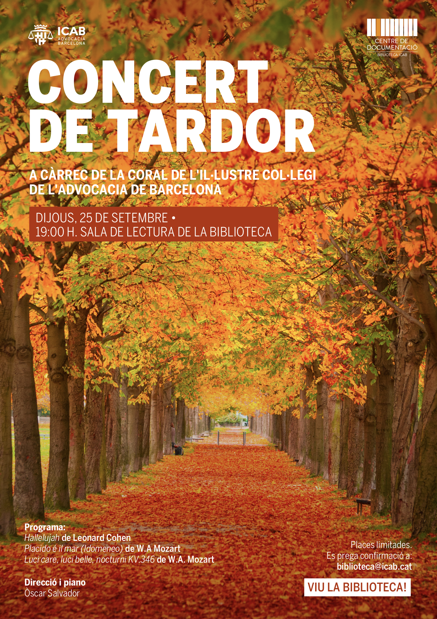 La Biblioteca de l’Il·lustre Col·legi de l’Advocacia de Barcelona acollirà el proper 25 de setembre de 2025, a les 19 h, el tradicional Concert de tardor de música clàssica, dins del cicle Viu la Biblioteca.