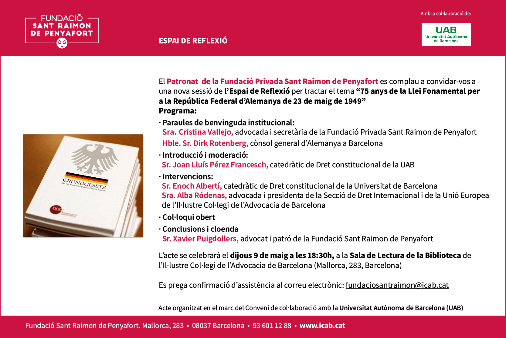 El Patronat de la Fundació Privada Sant Raimon de Penyafort es complau a convidar-vos a una nova sessió de l’Espai de Reflexió per tractar el tema “75 anys de la Llei Fonamental per a la República Federal d’Alemanya de 23 de maig de 1949”.