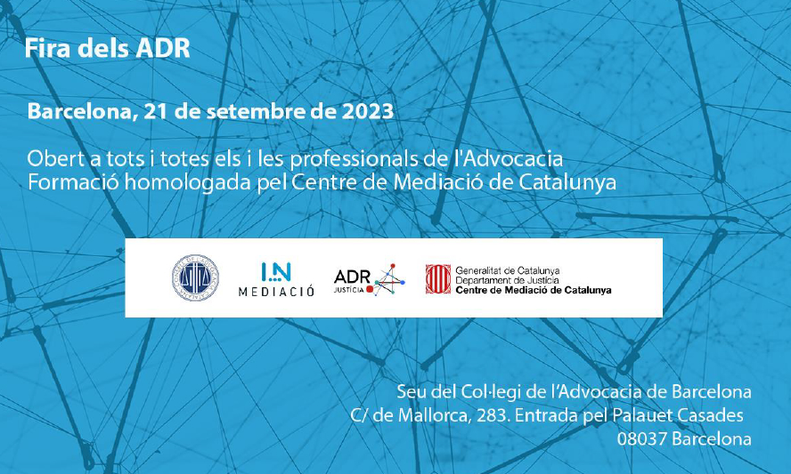 Barcelona acollirà el 21 de setembre la Fira dels ADR 2023, organitzada pel Consell de l'Advocacia de Catalana amb el suport de l'Il·lustre Col·legi de l'Advocacia de Barcelona i del Departament de Justícia, Drets i Memòria de la Generalitat de Catalunya.