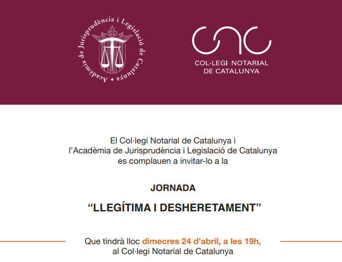 El Col·legi Notarial de Catalunya i l’Acadèmia de Jurisprudència i Legislació de Catalunya es complauen a invitar-lo a la jornada “Llegítima i desheretament”, que tindrà lloc dimecres 24 d’abril, a les 19h, al Col·legi Notarial de Catalunya