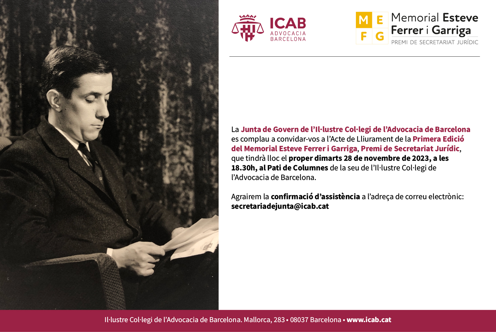 La Junta de Govern de l’Il·lustre Col·legi de l’Advocacia de Barcelona convoca l’Acte de Lliurament de la Primera Edició del Memorial Esteve Ferrer i Garriga, Premi de Secretariat Jurídic, que tindrà lloc el proper dimarts 28 de novembre de 2023, a les 18:30h, al Pati de Columnes de la seu de l’il·lustre Col·legi de l’Advocacia de Barcelona.