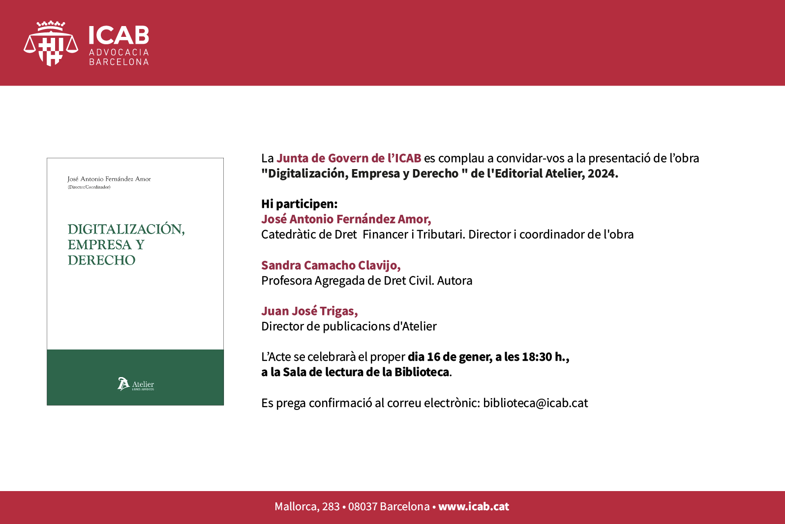 Es prega confirmació al correu electrònic: biblioteca@icab.cat