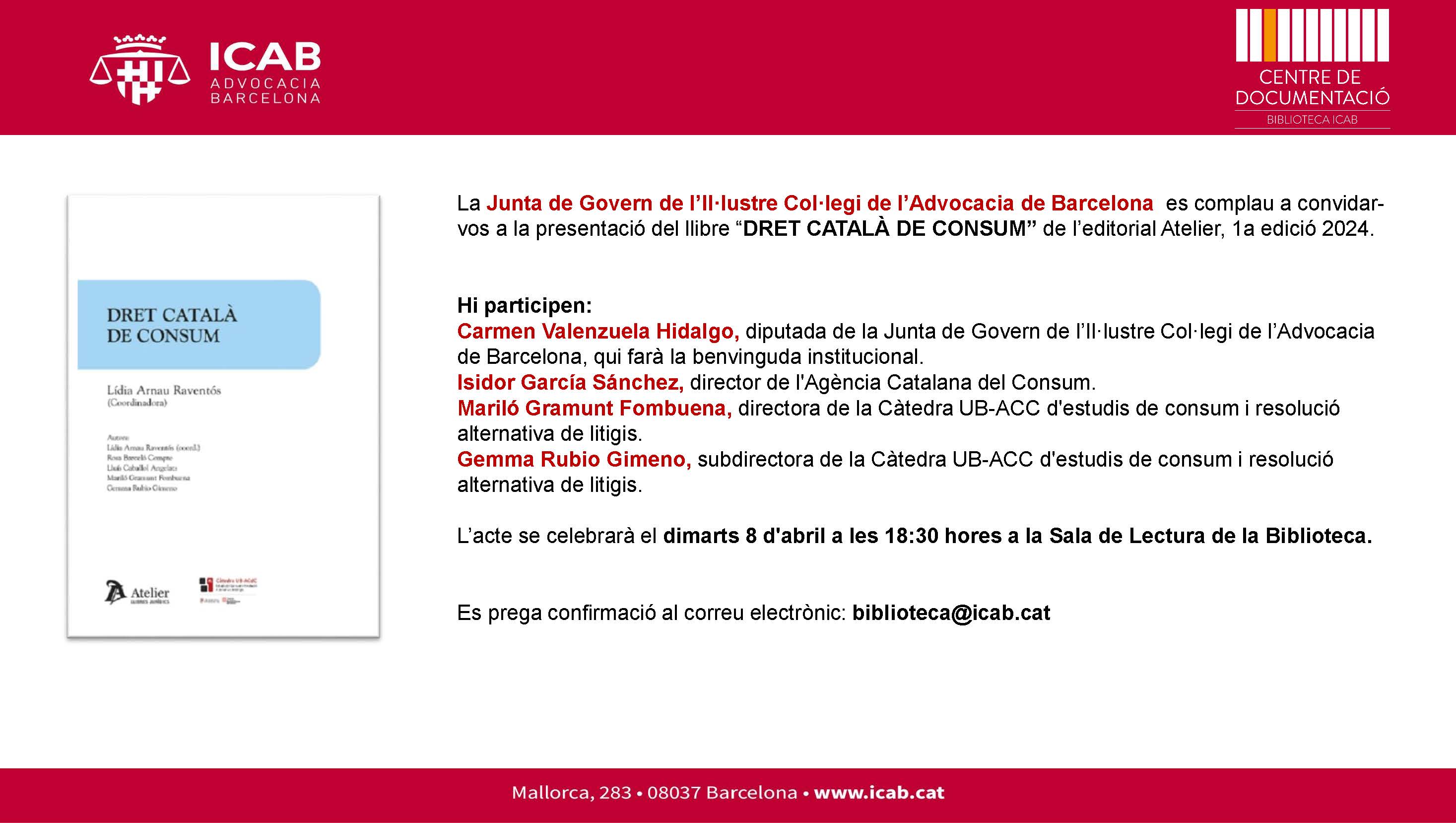 La Biblioteca de l'Il·lustre Col·legi de l'Advocacia de Barcelona (ICAB) acollirà el pròxim dimarts, 8 d'abril del 2025, a les 18:30 h, la presentació del llibre "Dret Català de Consum", de l’editorial Atelier, 1a edició 2024.