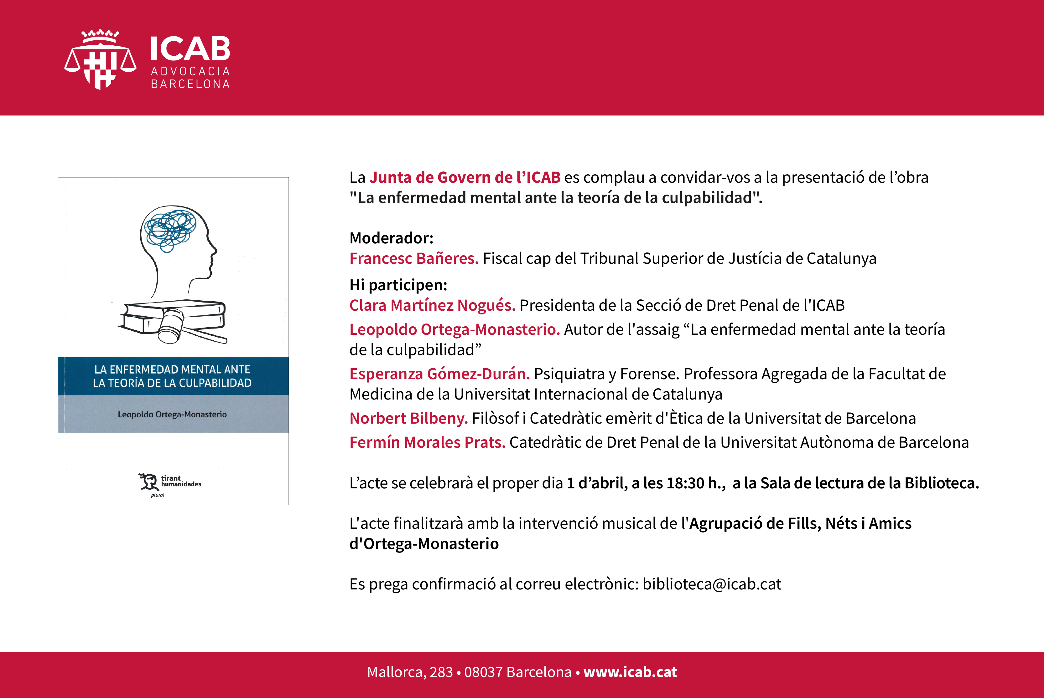 La Biblioteca de l'Il·lustre Col·legi de l'Advocacia de Barcelona (ICAB) acollirà el pròxim dimarts, 1 d'abril del 2025, a les 18.30 h, la presentació del llibre "La enfermedad mental ante la teoría de la culpabilidad", una obra escrita per Leopoldo Ortega-Monasterio, psiquiatre i forense.