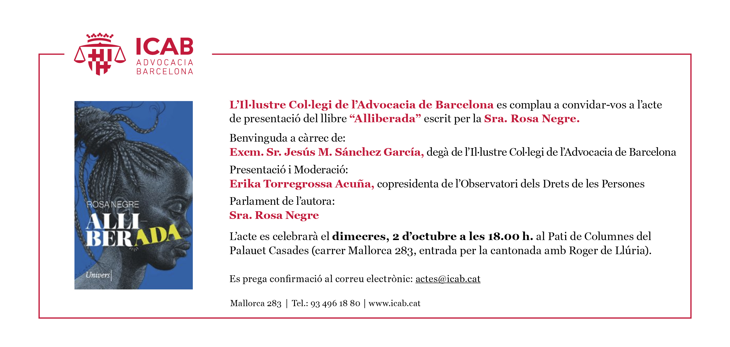 L’Il·lustre Col·legi de l’Advocacia de Barcelona acull l’acte de presentació del llibre “Alliberada” escrit per la Sra. Rosa Negre.