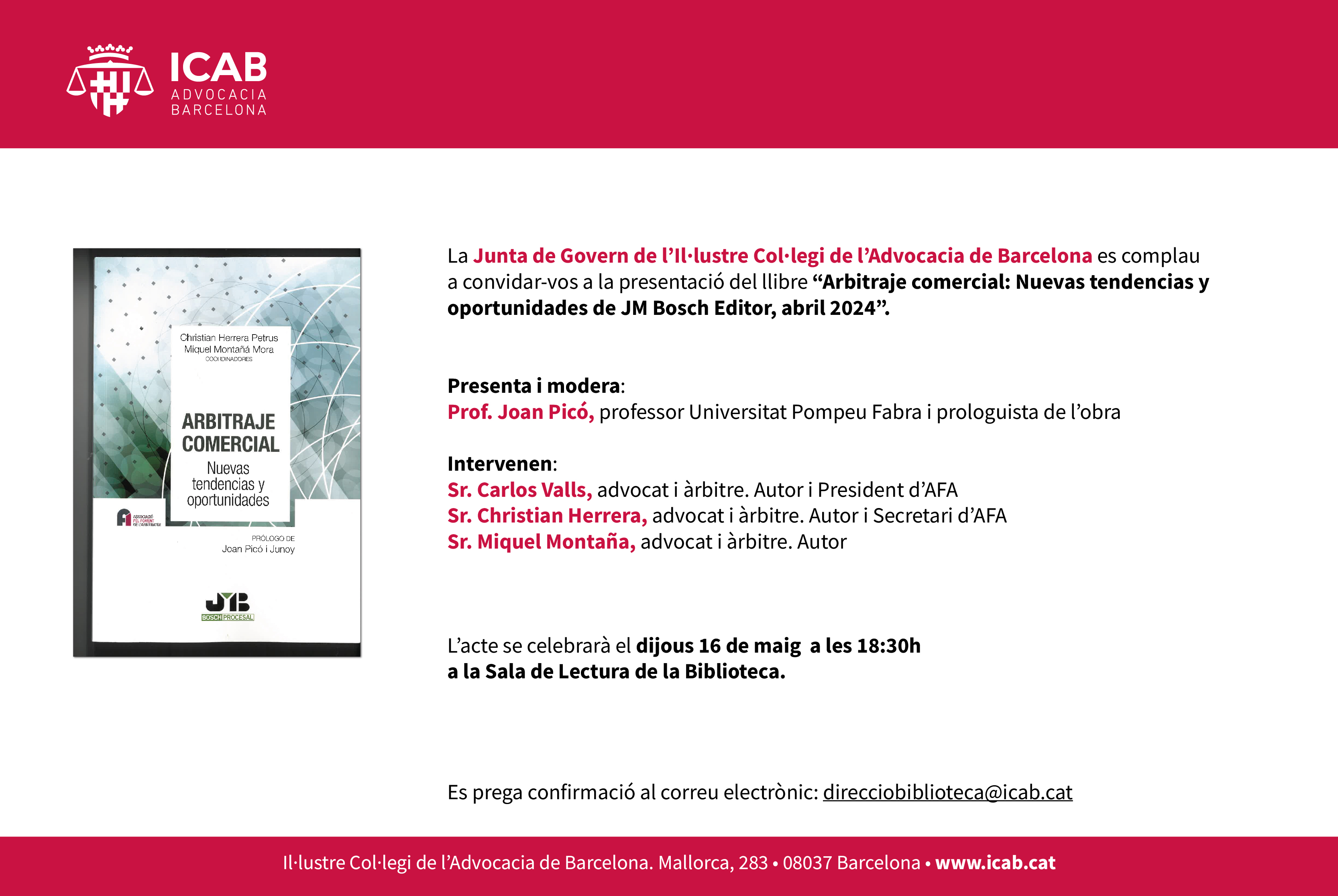 La Junta de Govern de l’Il·lustre Col·legi de l’Advocacia de Barcelona (ICAB) es complau a convidar-vos a la presentació del llibre “Arbitraje comercial: Nuevas tendencias y oportunidades de JM Bosch Editor, abril 2024”.