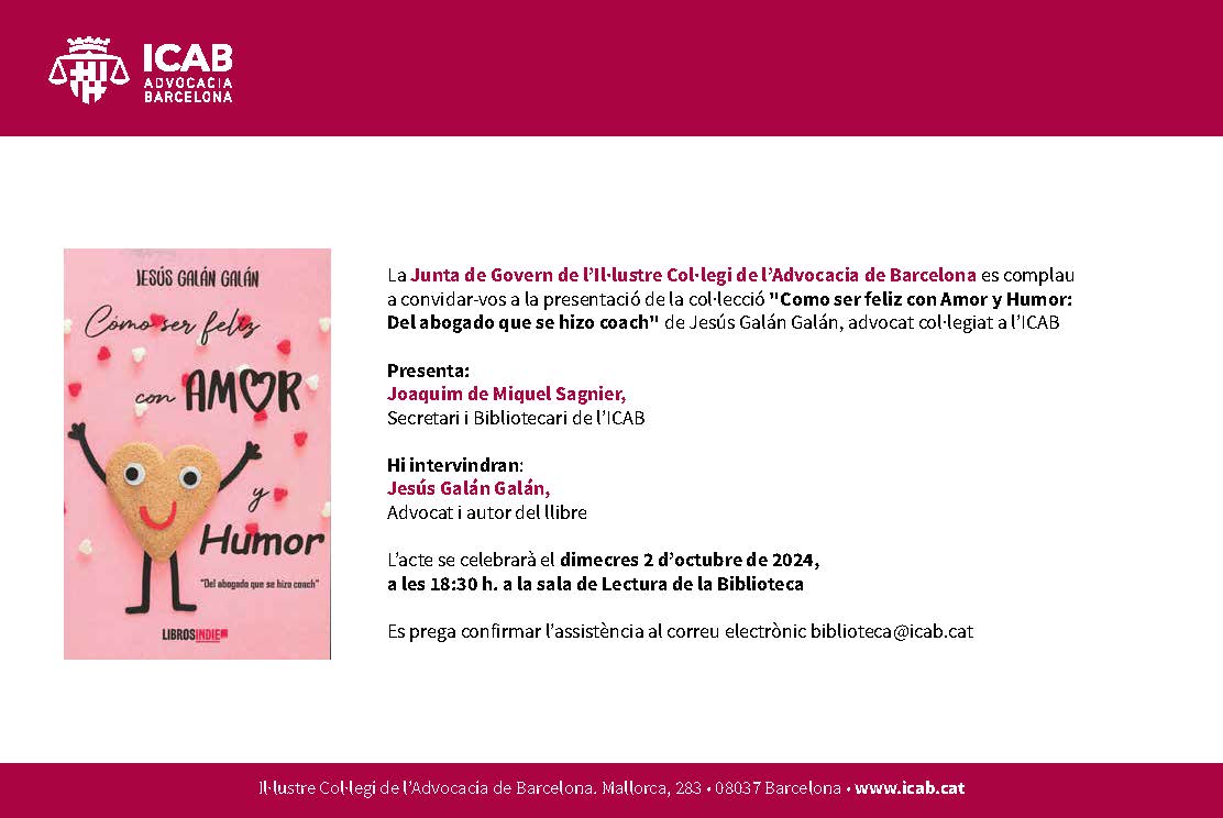 L’Il·lustre Col·legi de l’Advocacia de Barcelona acollirà la presentació del llibre "Cómo ser feliz con Amor y Humor: Del abogado que se hizo coach", de Jesús Galán Galán, advocat col·legiat a l’ICAB.