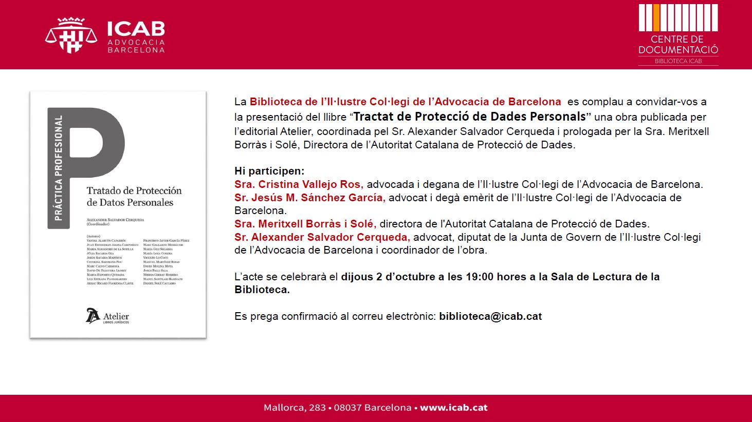 El proper 2 d’octubre de 2025, a les 19.00h, la Sala de Lectura de la Biblioteca de l’ICAB acollirà la presentació de l’obra “Tractat de Protecció de Dades Personals", una obra publicada per l’editorial Atelier, coordinada pel Sr. Alexander Salvador Cerqueda i prologada per la Sra. Meritxell Borràs i Solé, Directora de l’Autoritat Catalana de Protecció de Dades.