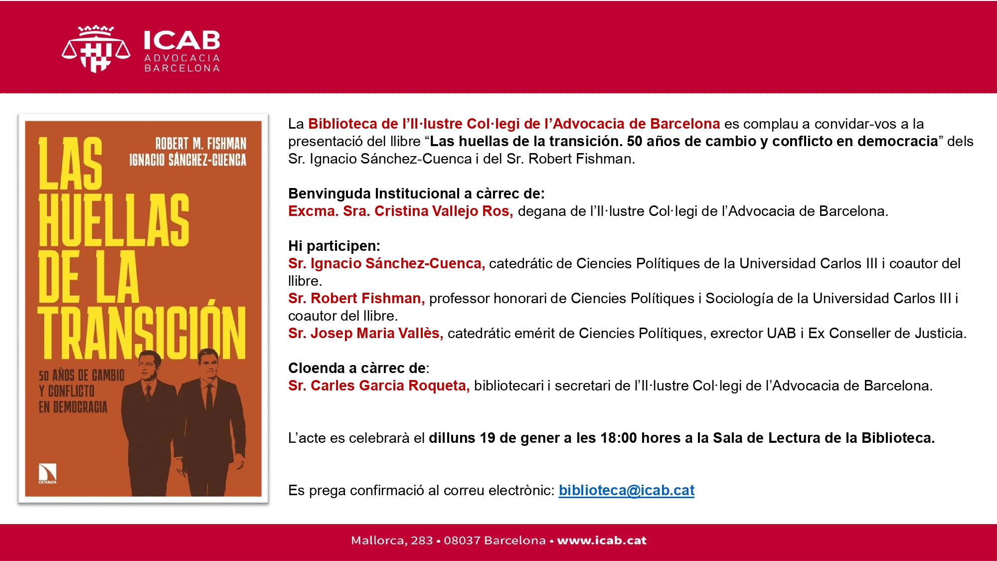Es prega confirmació al correu electrònic: direcciobiblioteca@icab.cat