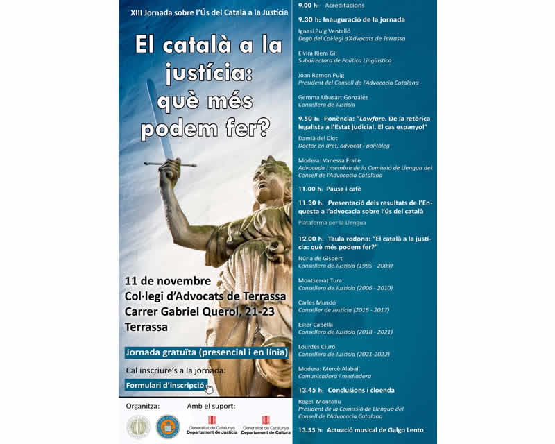 La XIII Jornada sobre l’Ús del Català a la Justícia: “El català a la justícia: què més podem fer?”, que organitza el Consell de l'Advocacia Catalana amb la col·laboració del Col·legi d’Advocats de Terrassa, tindrà lloc el dia 11 de novembre de 2022.