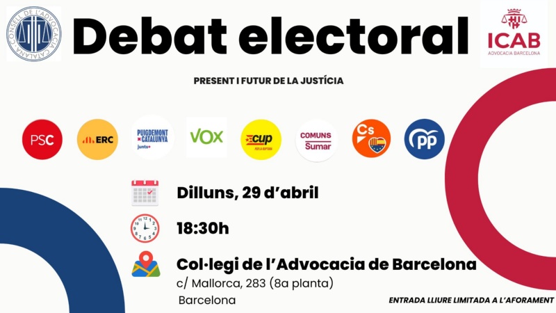 El debat es farà el dilluns dia 29 d’abril, a partir de les 18:30h, a la seu del Col·legi de l’Advocacia de Barcelona i comptarà amb la participació de Ferran Pedret (PSC), Ana Balsera (ERC), Quim Jubert (Junts+), Sergio Macián (VOX), Xavier Pellicer (CUP), Andrés García Berrio (Comuns Sumar), Sonia Reina (Ciutadans) i Àngels Esteller (PP).