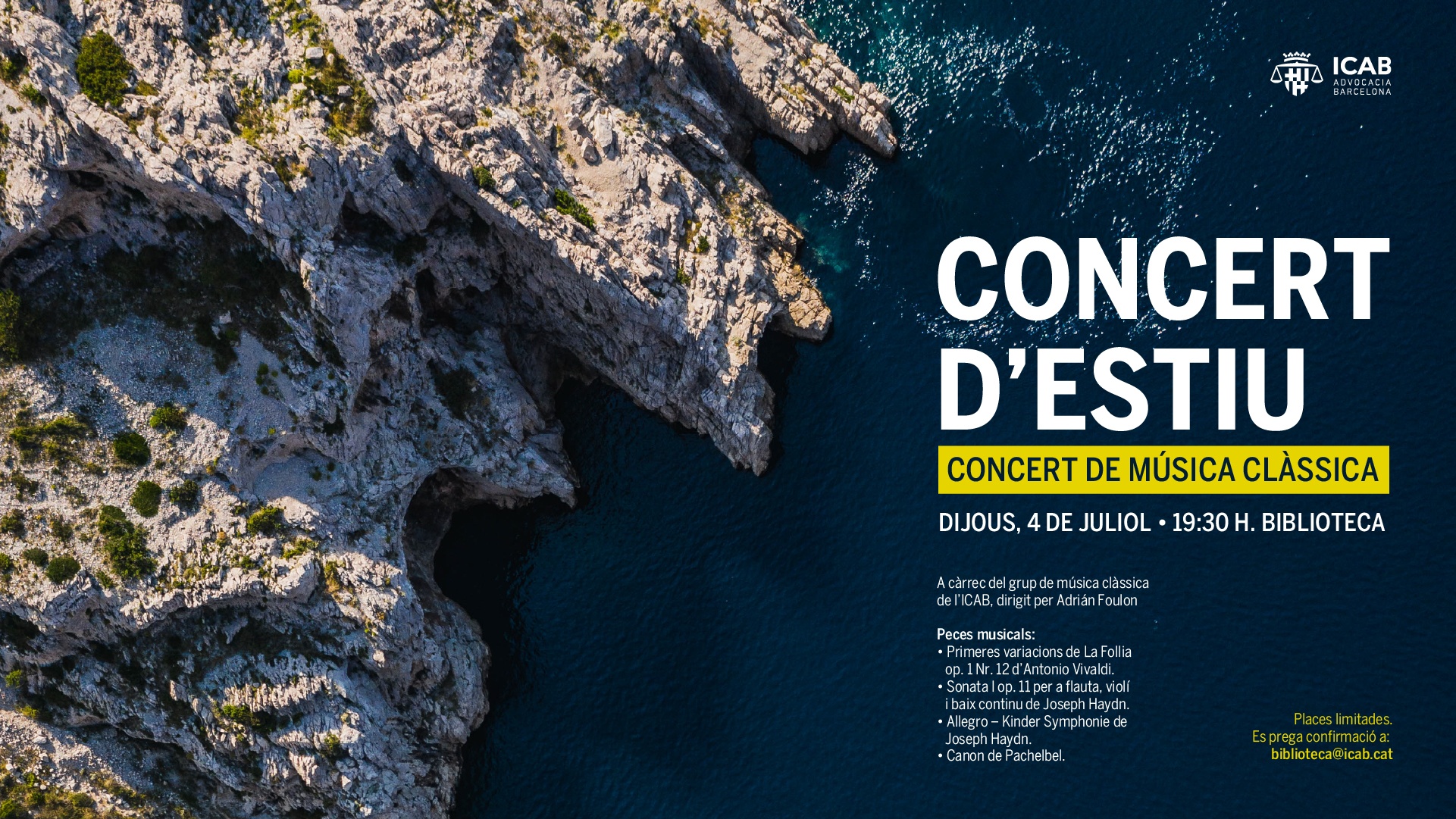 El dia 4 de juliol de 2024, a les 19.30h, tindrà lloc a la Biblioteca de l'Il·lustre Col·legi de l'Advocacia de Barcelona (ICAB) el Concert d'Estiu a càrrec del grup de música clàssica del Col·legi.