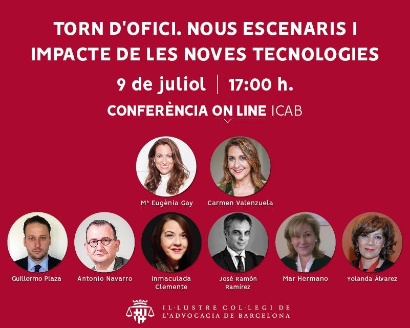 El Col·legi de l'Advocacia de Barcelona (ICAB) va organitzar el dijous 9 de juliol de 2020, a les 17h, la conferència on-line 'Torn d'ofici. Nous escenaris i impacte de les noves tecnologies'. La degana, Mª Eugènia Gay, va presentar la sessió, que va estar moderada per Carmen Valenzuela, diputada de la Junta de Govern responsable del Torn d'Ofici.