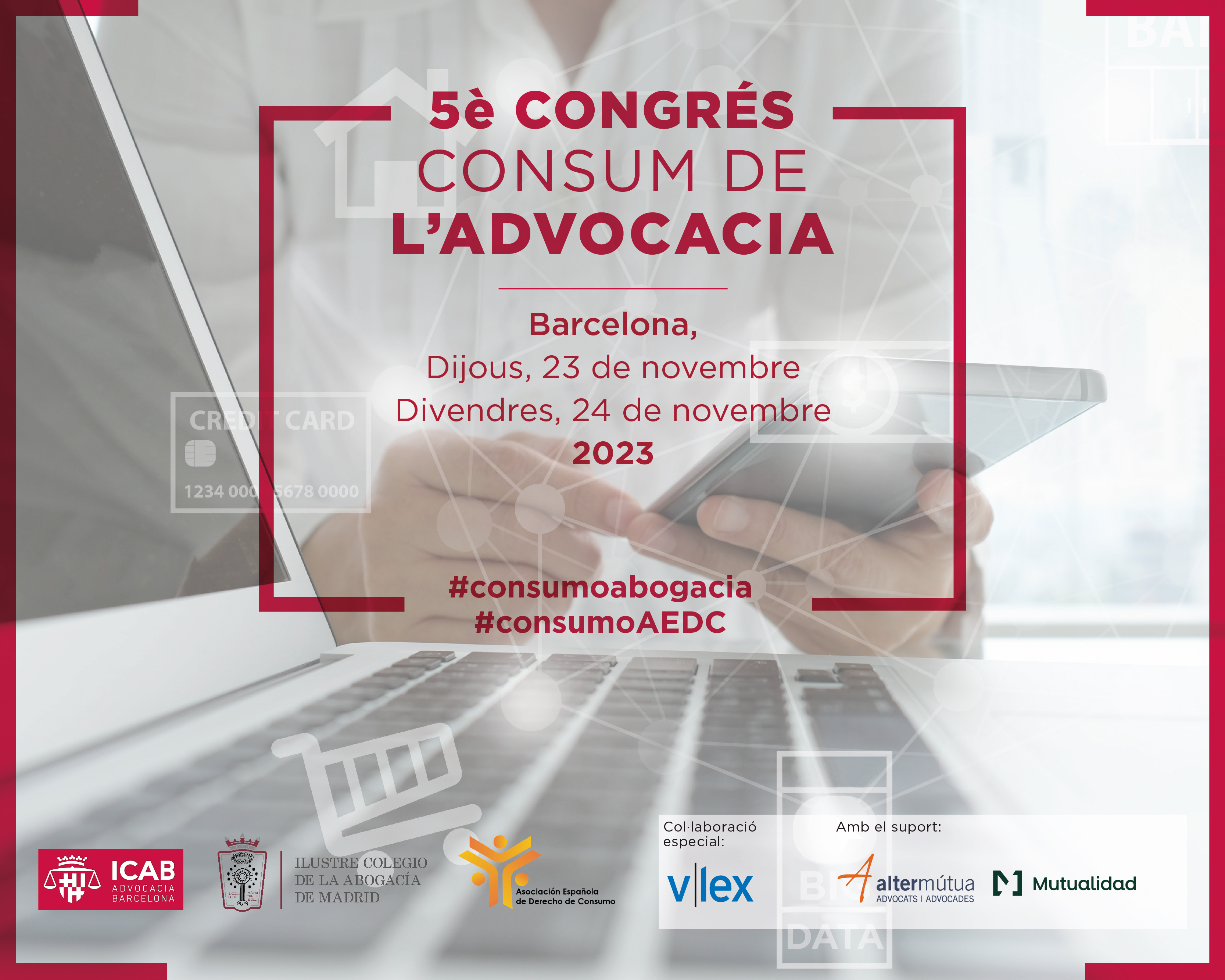 Els Col·legis de l’Advocacia de Barcelona (ICAB) i de Madrid (ICAM) i l’Asociación Española de Derecho de Consumo (AEDC), organitzen el V Congrés de Consum de l’Advocacia, que tindrà lloc els dies 23 i 24 de novembre al Palauet Casades, seu de l’advocacia barcelonina.