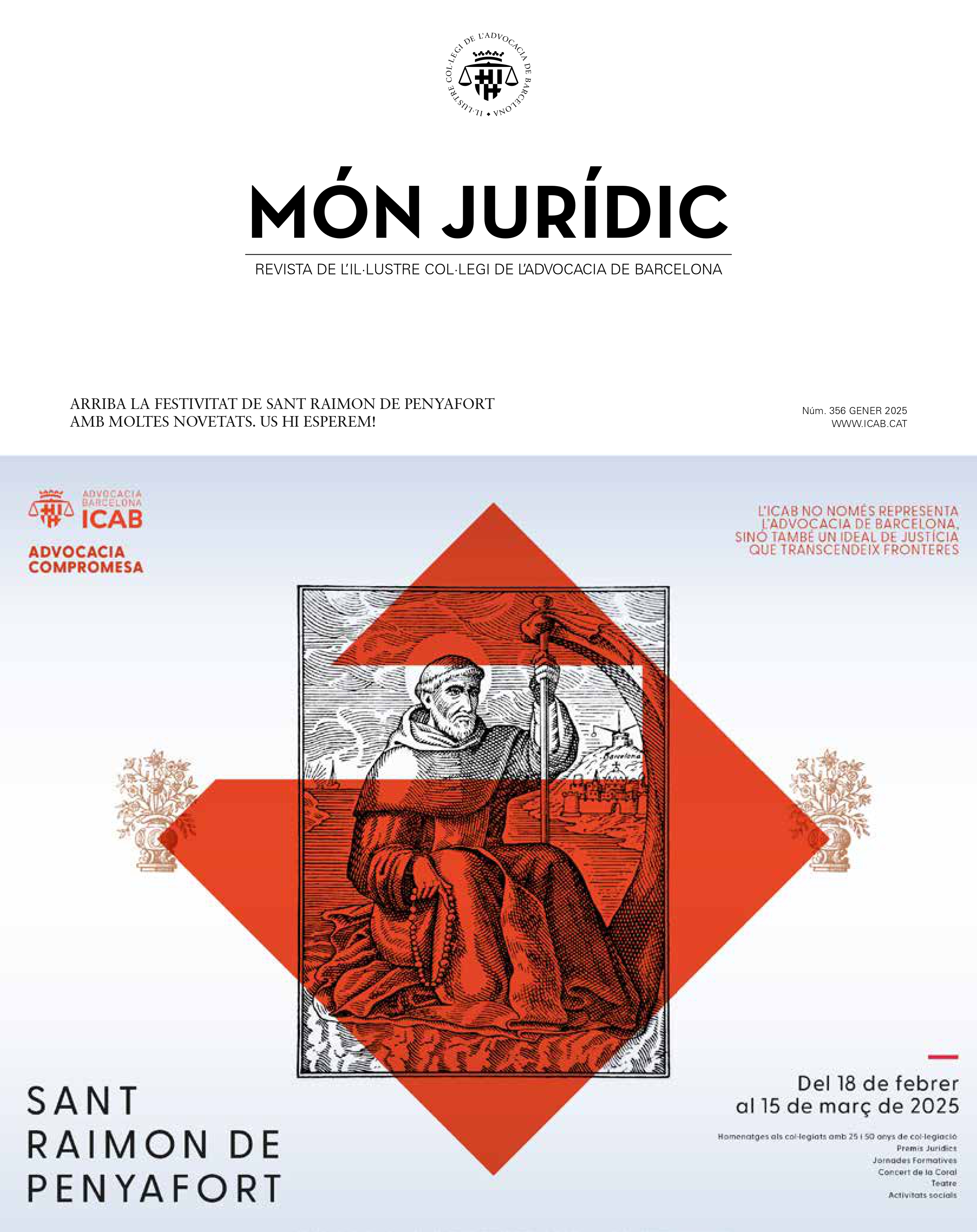 En portada destaquem la propera festivitat de Sant Raimon, que tindrà lloc del 18 de febrer al 15 de març de 2025, en el marc de la qual es realitzaran una trentena d'activitats culturals, socials, esportives i formatives sota el lema “L’ICAB no només representa l’advocacia de Barcelona, sinó també un ideal de justícia que transcendeix fronteres”.