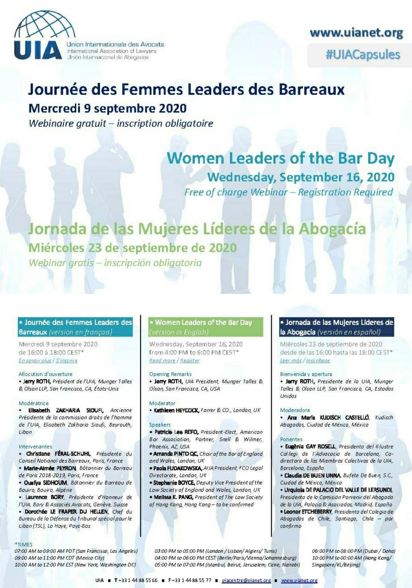 La UIA organitza els dimecres 9, 16 i 23 de setembre de 2020 unes jornades virtuals (webinars) sobre les Dones Líders de l'Advocacia. En la sessió del dia 23 participarà com a ponent Mª Eugènia Gay, degana del Col·legi de l'Advocacia de Barcelona (ICAB). Webinars gratuïts, inscripció obligatòria.