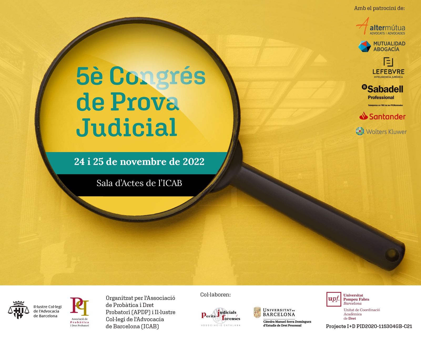 El Col·legi de l'Advocacia de Barcelona (ICAB) i l'Associació de Probàtica i Dret Probatori (APDP) organitzen per als propers 24 i 25 de novembre de 2022 el V Congrés de Prova Judicial amb l’objectiu d’abordar els elements a tenir en compte en relació a les proves personals, les estratègies en la prova documental i la prova pericial.