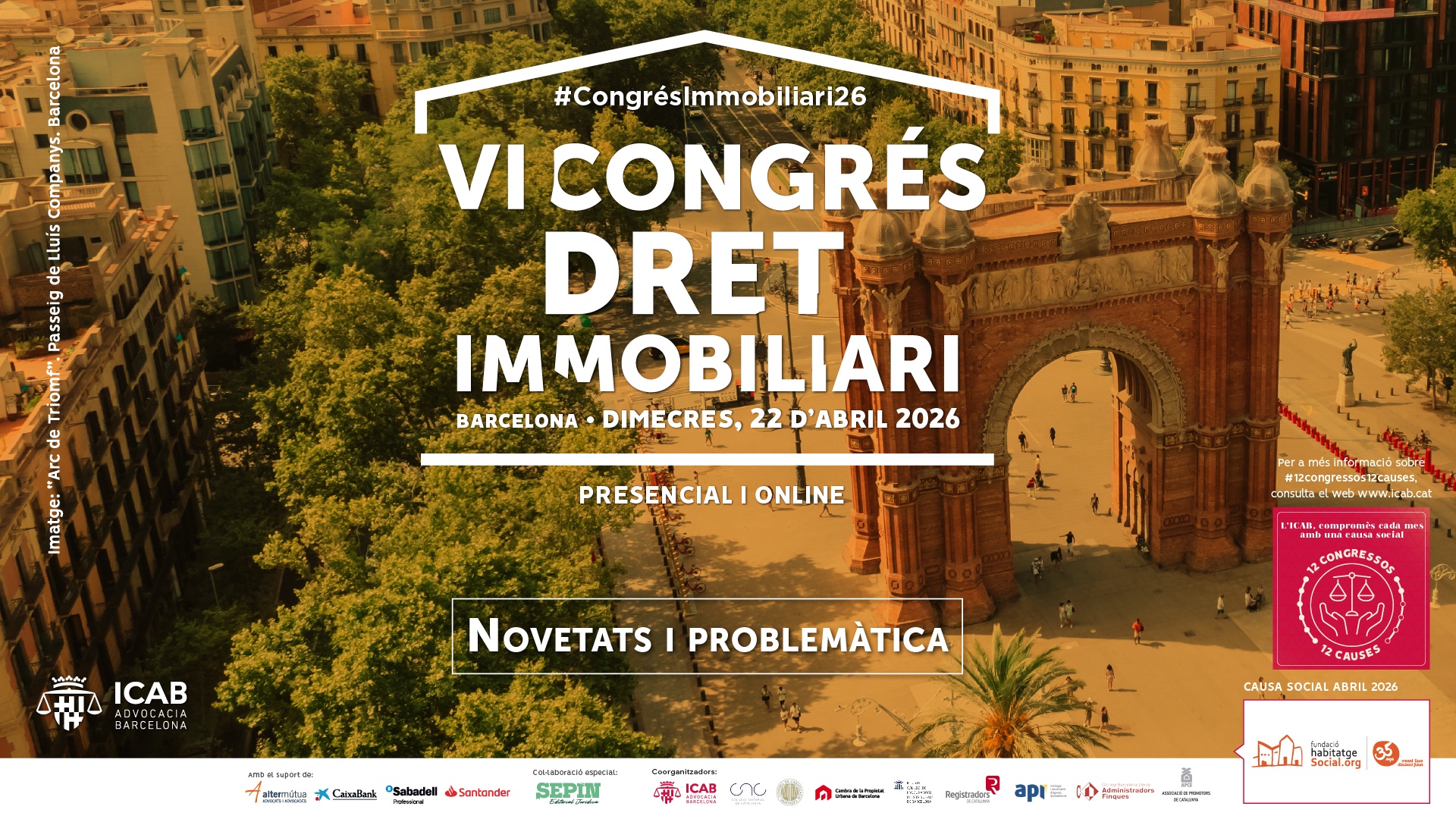 El VI Congrés de Dret Immobiliari forma part del projecte de la junta de Govern de l’ICAB, “12 Congressos, 12 Causes” amb el qual el Col·legi de l’Advocacia de Barcelona vol posar en valor la funció social de l’advocacia tot vinculant els principals congressos jurídics que organitza aquesta Corporació amb 12 entitats que treballen desinteressadament per transformar la societat, defensar els drets i millorar la vida de les persones. En aquesta ocasió el VI Congrés de Dret Immobiliari s’ha vinculat a l’Associació Habitatge Social, una entitat amb 35 anys d’experiència en la gestió d’habitatge social per als col·lectius més desafavorits. Els assistents rebran el llibre amb les ponències del ‘VI Congrés de Dret Immobiliari’, que ha editat l’ICAB i que ha comptat amb la causa social de la Fundació La Marató de TV3.