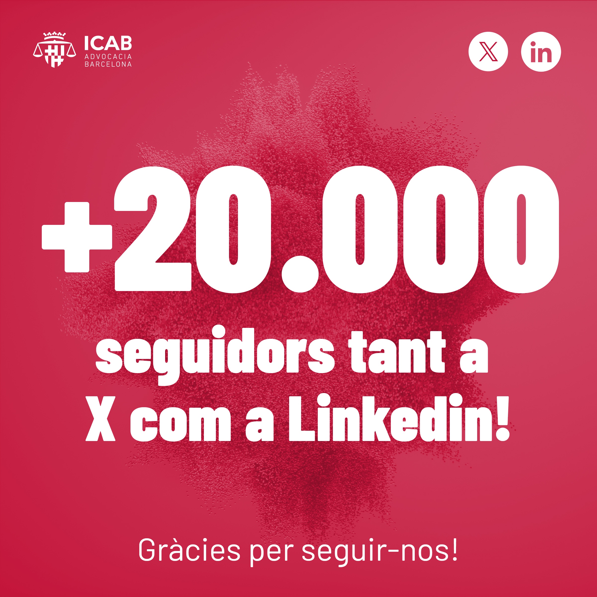 L’Il·lustre Col·legi de l’Advocacia de Barcelona (ICAB) ja ha assolit els 20.000 seguidors tant a X, antiga Twitter, com a LinkedIn. Aquesta fita no fa més que confirmar la tendència positiva de la Corporació a les principals xarxes socials, on no para de guanyar presència i visibilitat. Us aninem a seguir-nos! L’ICAB està present també a Instagram, Youtube i Vimeo.