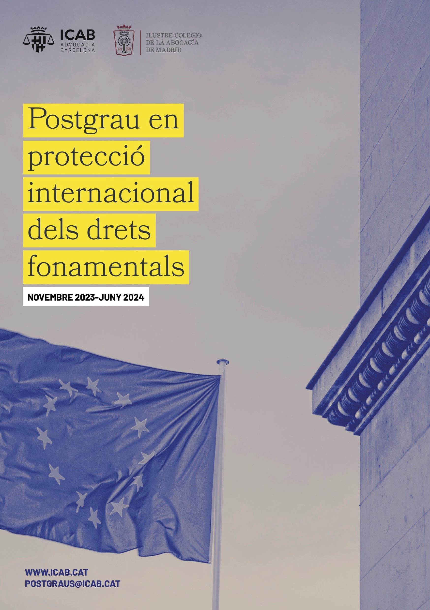 L'Il·lustre Col·legi de l'Advocacia de Barcelona (ICAB), amb la col·laboració de l'ICAM, engegarà al novembre la primera edició del Postgrau de Protecció Internacional dels Drets Fonamentals amb l'objectiu d'impulsar la carrera professional dels col·legiats i col·legiades a nivell internacional. Matrícula oberta!
